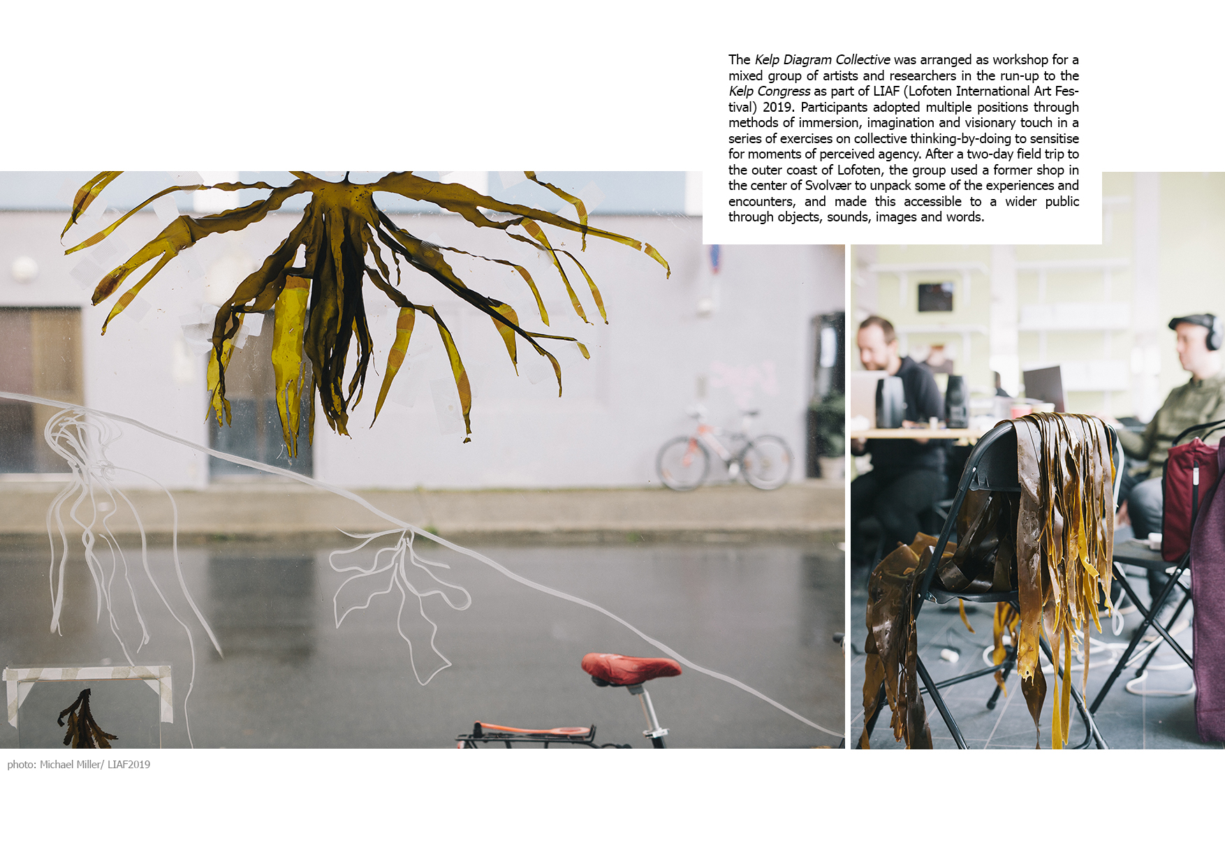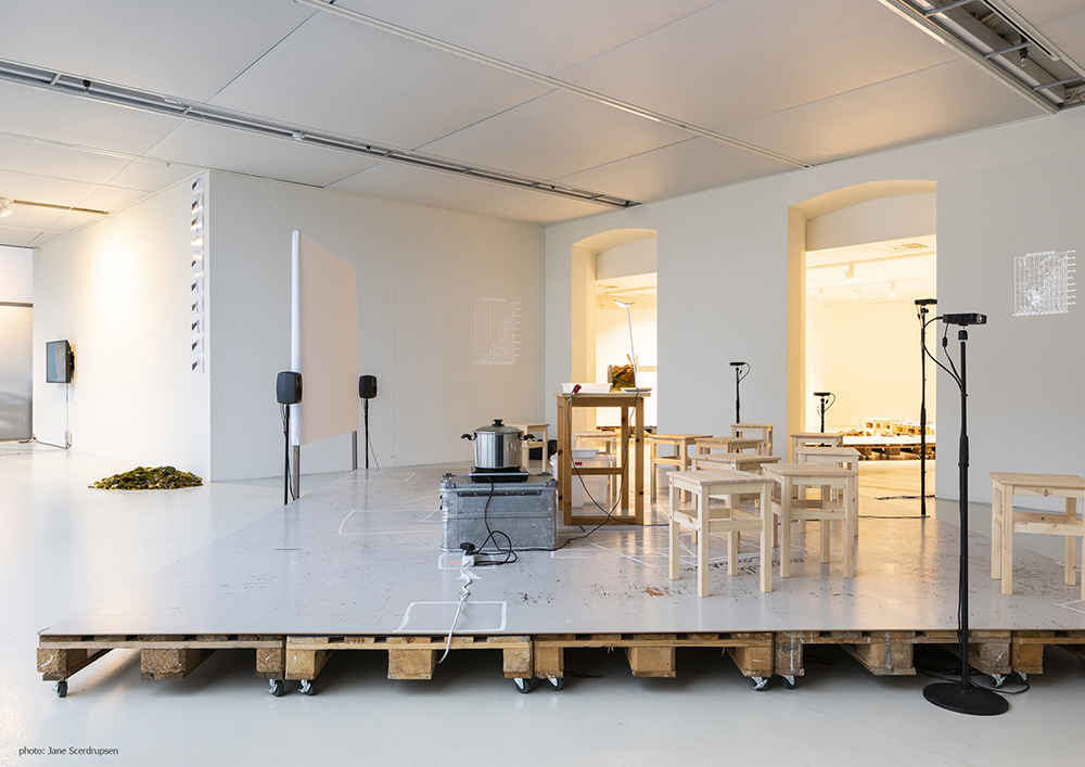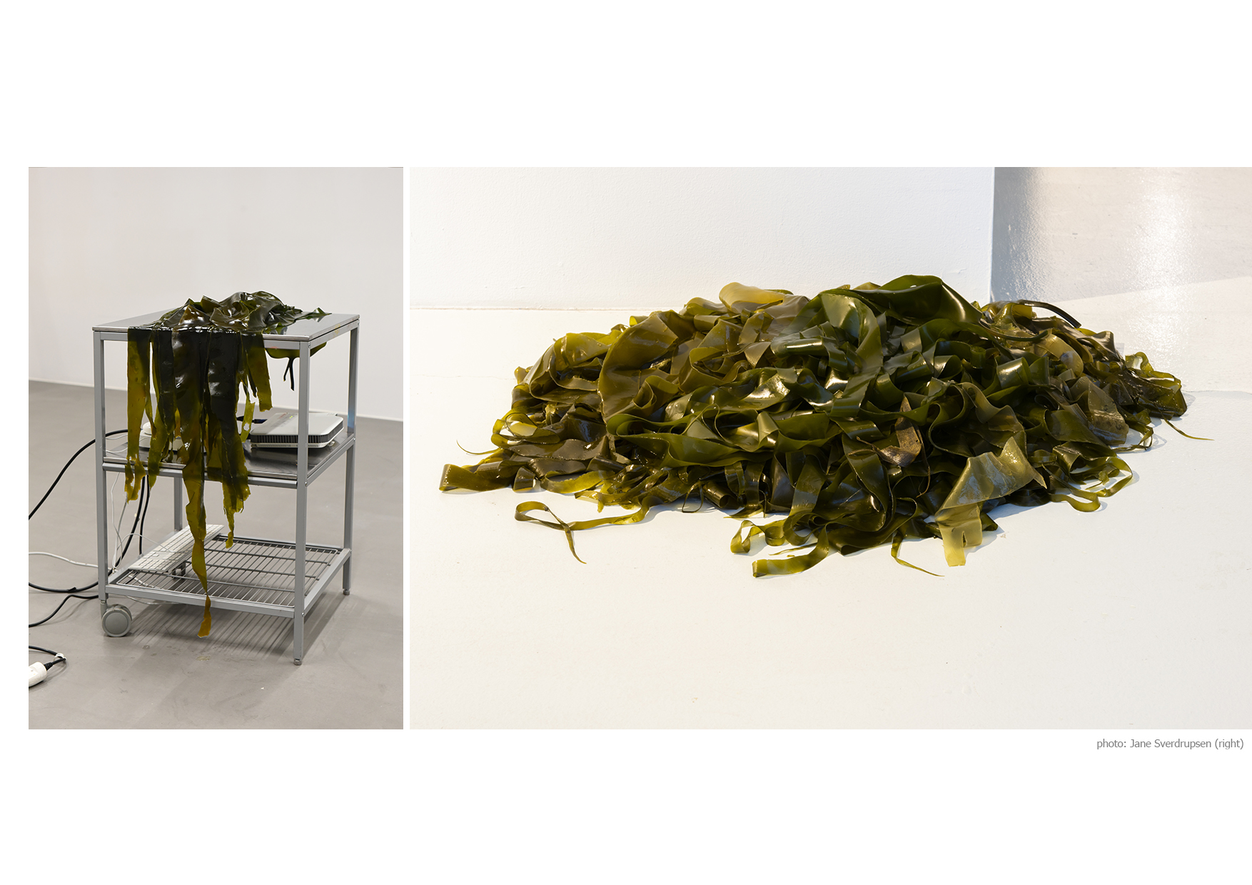 Visningsrommet USF is transformed into a relay station or platform in an ongoing negotiation of forests beneath the surface of the sea. It originates from the project Agential Matter (Invisible Landscapes), coming now to an end as artistic research fellowship at The Art Academy at KMD (Faculty of Fine Art, Music and Design, University of Bergen). The work arises from journeys along the coast to pay visits to diverse places, where interests regarding undetermined futures nurture the observation of algae. It is based on the entanglement of personal and socio-political concerns.