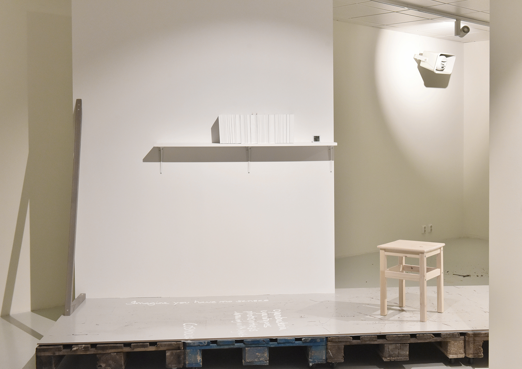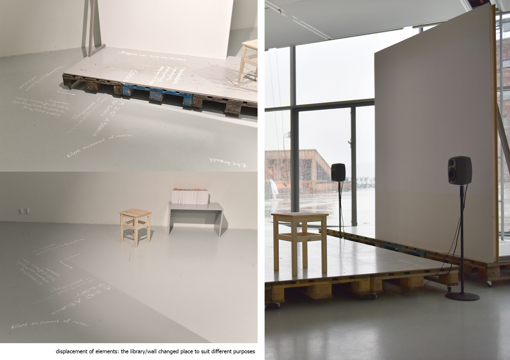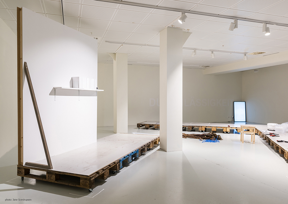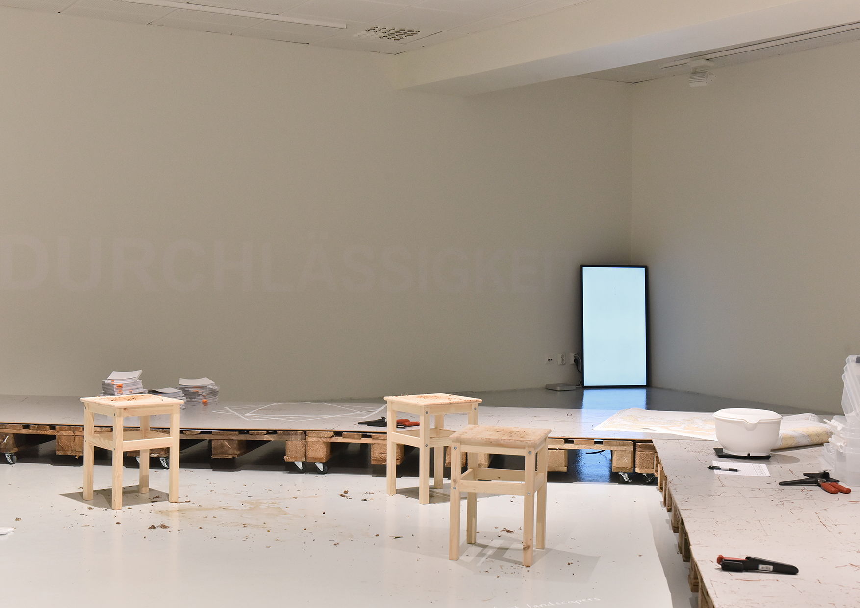 Visningsrommet USF is transformed into a relay station or platform in an ongoing negotiation of forests beneath the surface of the sea. It originates from the project Agential Matter (Invisible Landscapes), coming now to an end as artistic research fellowship at The Art Academy at KMD (Faculty of Fine Art, Music and Design, University of Bergen). The work arises from journeys along the coast to pay visits to diverse places, where interests regarding undetermined futures nurture the observation of algae. It is based on the entanglement of personal and socio-political concerns.