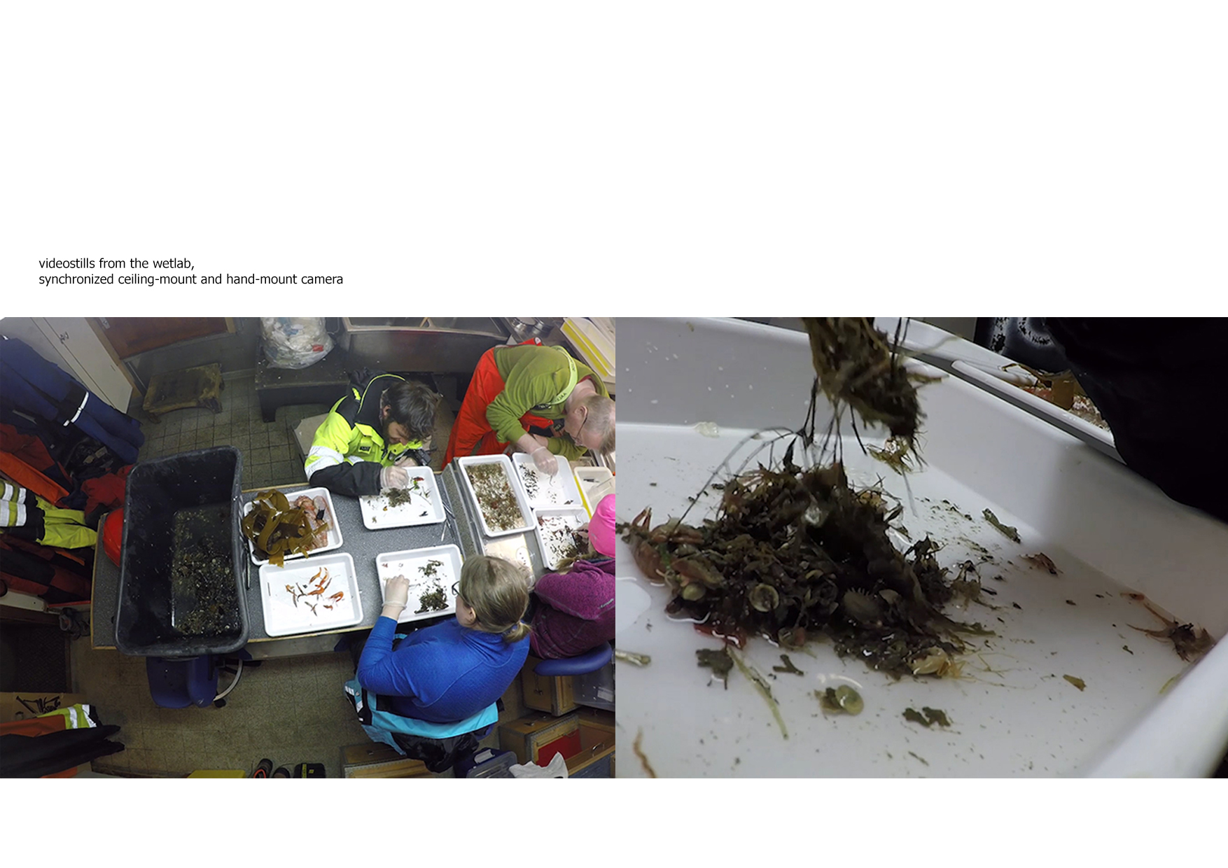Bruno Latour uses the term provocation in its more literal meaning: the production – or calling to the fore - of voices. In question is how to give voice to things, which have been regarded to have no speech. Algae have experienced a tremendously growing interest in various fields and in relation to a potentially innovative future. The work assembles a collection of images drawn from research on the internet, in books, in the studio and in the field – looking at economical and idealistic interests in algae, and following marine biologists with various tasks in their effort to give speech to algae and to those who form their wider community. Algae, instruments, water, humans and physical parameters come here together in an always-changing complex system.