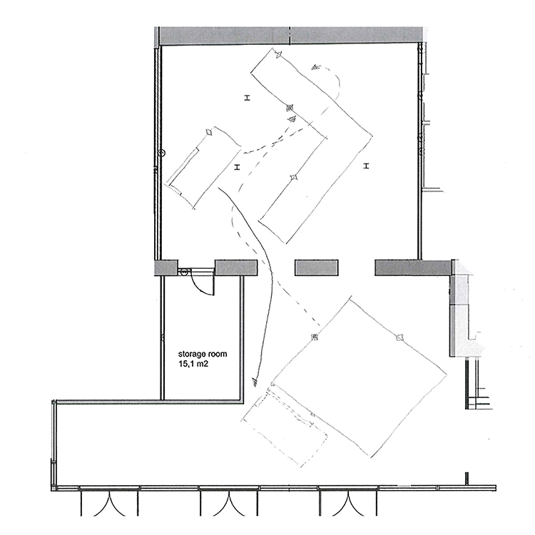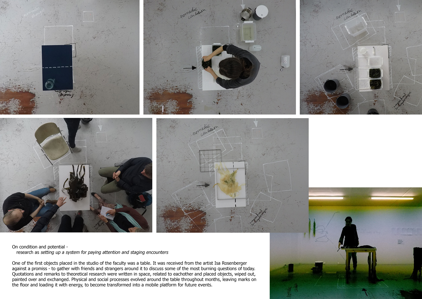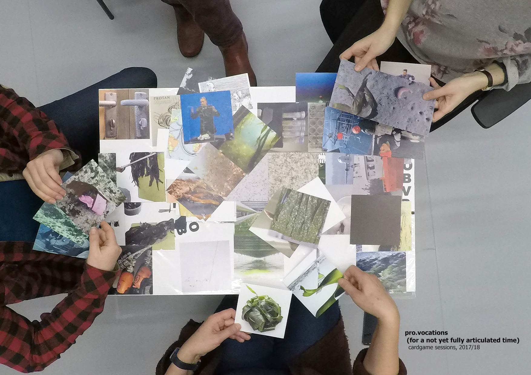 pro.vocations (for a not yet fully articulated time) has taken shape in several versions: the first one is a floor installation, reminiscent of an oversized board game, provoking the movements of an audience along and between images, where drawn lines suggest displacements of and restrictions to image-objects and bodies. The second version takes shape as a set of cards (with the same images) to be played out and kept moving as long as a text is read aloud. Both versions investigate the image as part of a game, and play with the disruption and re-alignment of parallel timelines of a visual and auditive (or mental) narrative, which in a documentary film or video essay would give form to a narrative composed of relating fragments, controlled in its seriality by an author.