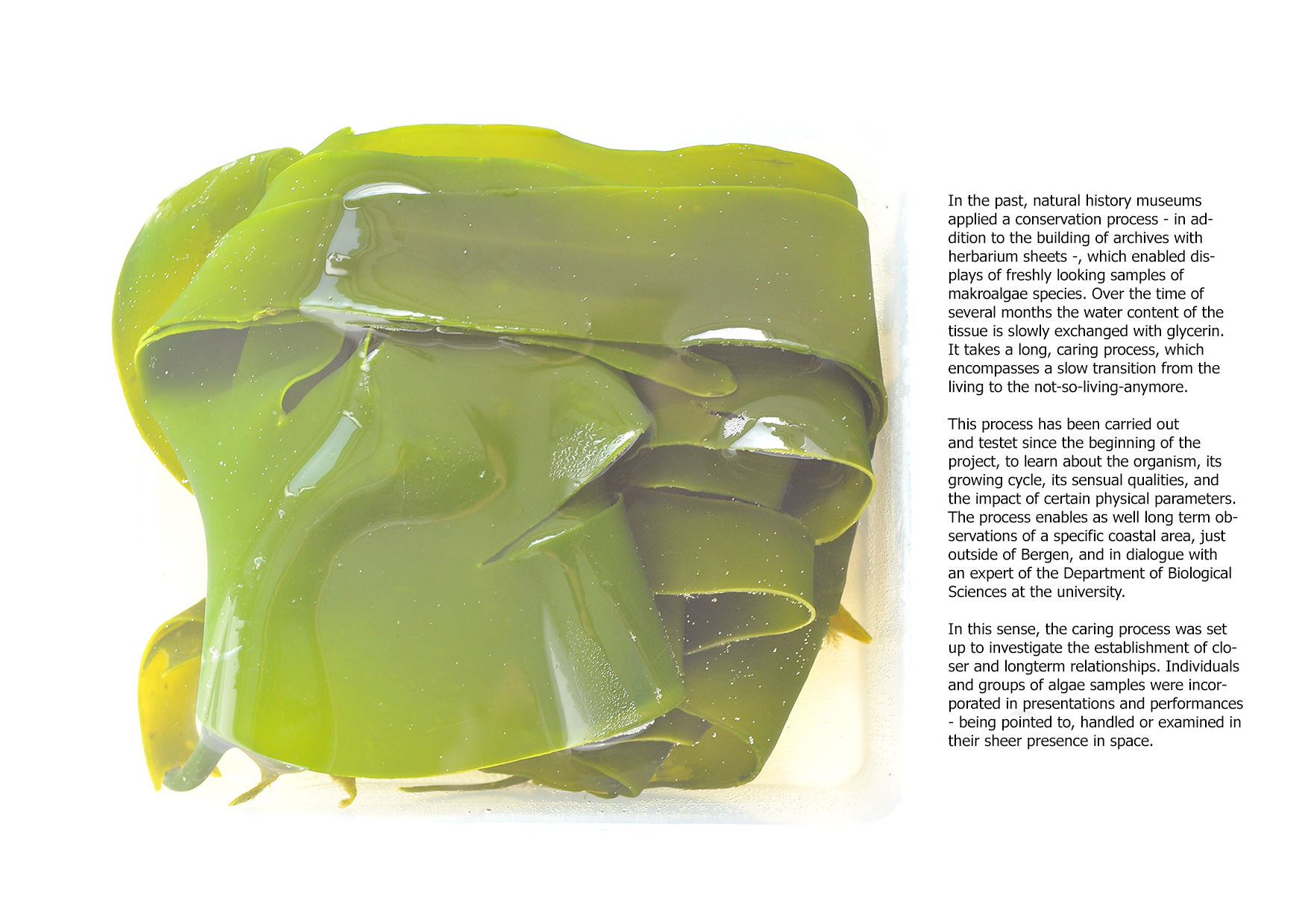 These stays are not only the source of material. They are rather understood as an intervening attention and care for processes in encounters between algae, bodies and objects, and a want to trace relations and mutual impact. Porosity enables reciprocal shaping and penetration.