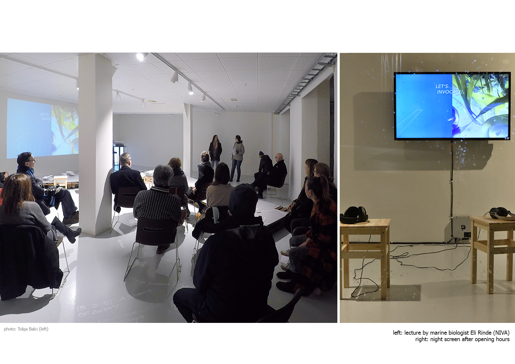 The project bears characteristics of the documentary, nevertheless has no linear narrative. The gaze shifts between distanced observation and the experience of intense immersion. Fragments are out of their context, outside of their respective ecologies, out of the laboratory, the landing station or out of the sea, they are displaced, isolated and present in the gallery space. As much as they are just there, present, they are indexes to another space and another discourse – as elements in the performance, or in the form of an image archive requiring activation to see the lines. The interest lies not in the parts, but between the parts themselves. What happens here is an extension of the journey, and the sea is there - right outside the door.