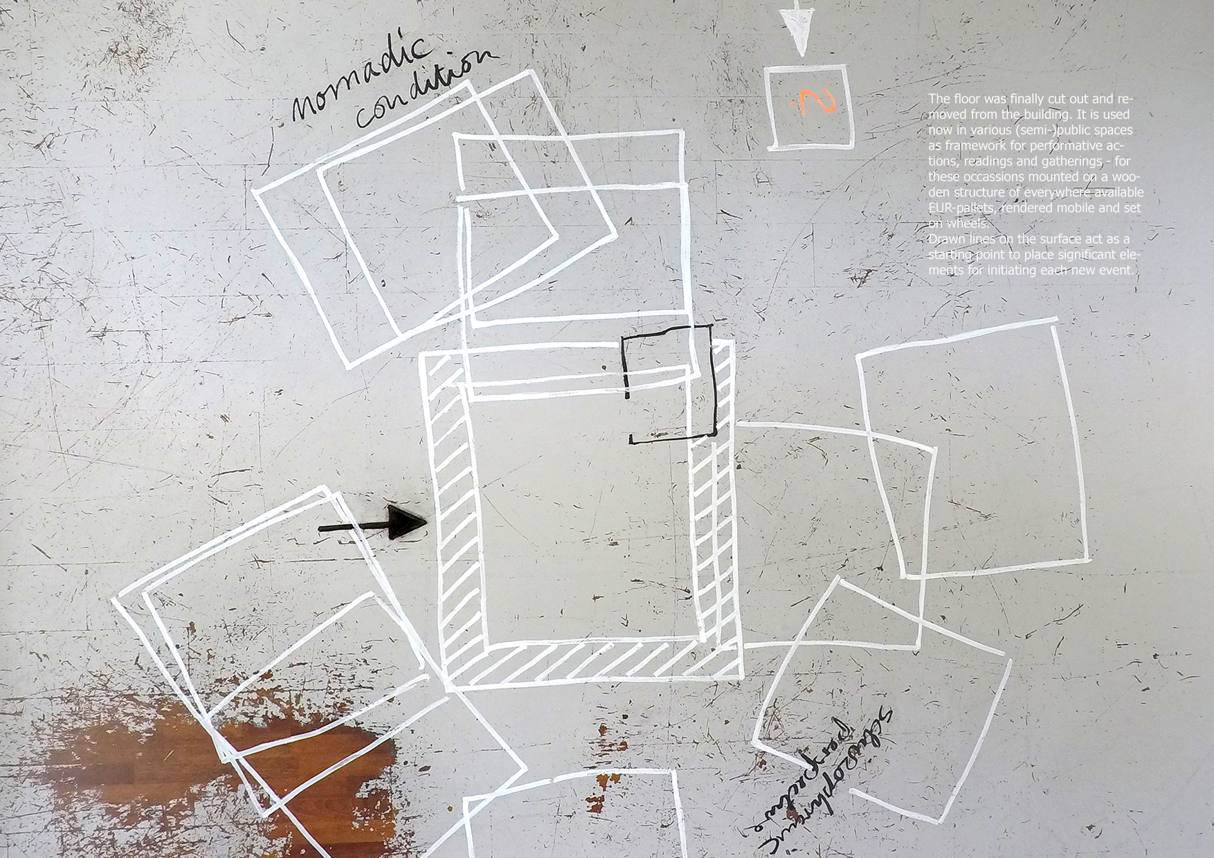 pro.vocations (for a not yet fully articulated time) has taken shape in several versions: the first one is a floor installation, reminiscent of an oversized board game, provoking the movements of an audience along and between images, where drawn lines suggest displacements of and restrictions to image-objects and bodies. The second version takes shape as a set of cards (with the same images) to be played out and kept moving as long as a text is read aloud. Both versions investigate the image as part of a game, and play with the disruption and re-alignment of parallel timelines of a visual and auditive (or mental) narrative, which in a documentary film or video essay would give form to a narrative composed of relating fragments, controlled in its seriality by an author.