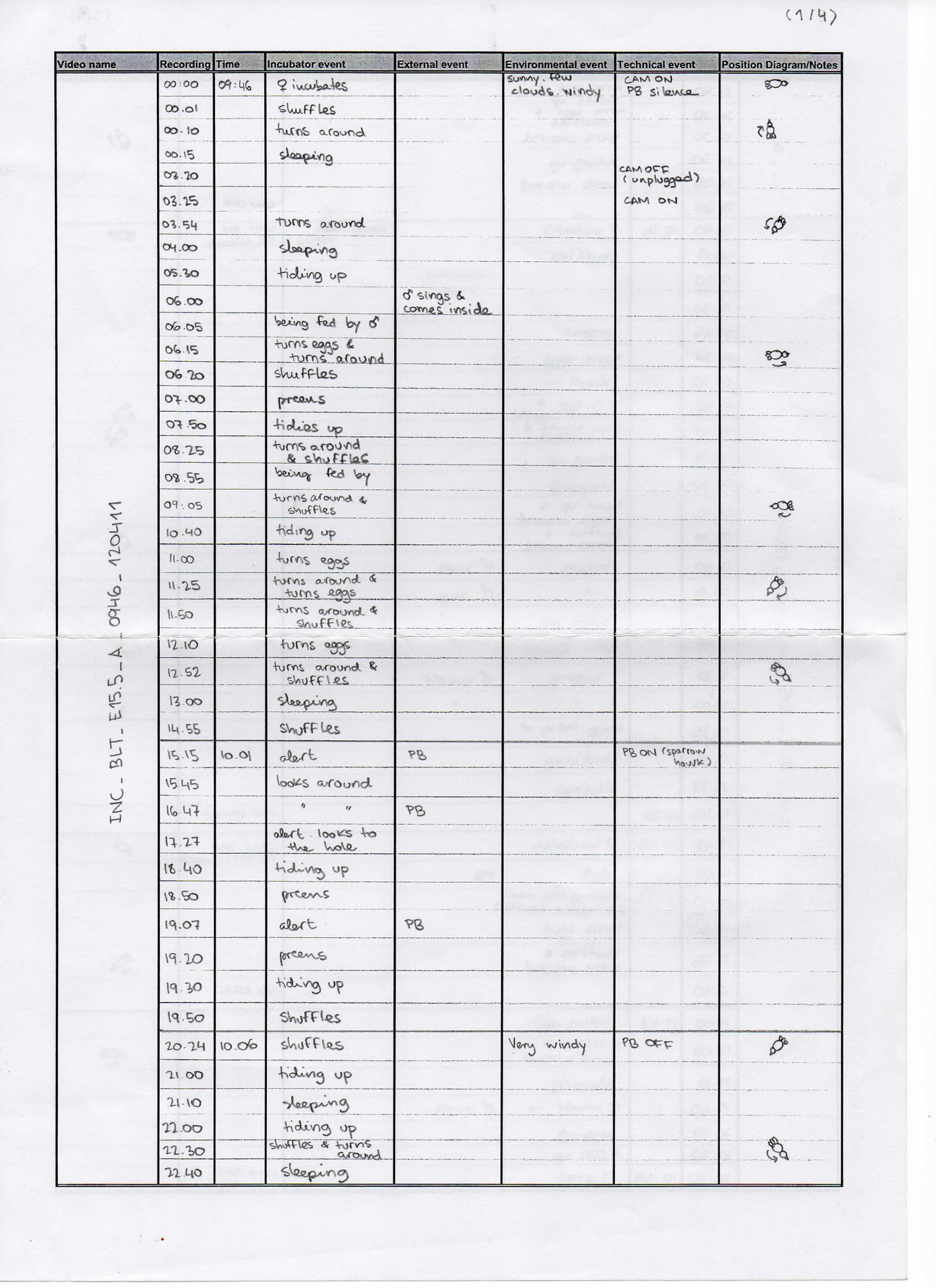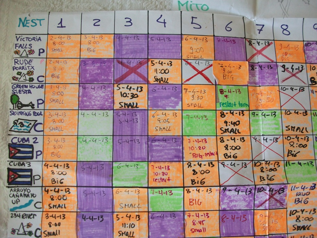 Neben den GPS Markierungen entwickeln die Forscher zusätzlich eine Illustration für jedes Nest. Das erleichtert die Wiedererkennung und die Einprägung der Nester. Meist beinhaltet diese Skizze eine Anekdote über die Umstände, die regionalen Gegebenheiten und die Situation unter der das Nest gefunden wurde. Der Praktikant Juan hat beispielsweise ein Nest nach einer kurzen „Siesta“ unter einem Baum zufällig beim Aufwachen direkt über sich entdeckt. An einem Ort nahe einem Gewächshaus, das allen Biologen bekannt war. Die Illustration zeigt folglich Juan, der unter einem Baum liegt. Der Name „Green House Siesta“ fasst Situation und Ort zusammen. Die Bilder stehen am Anfang einer jeden Experimentiertabelle. Auf diese Weise wird nach den individuellen Erlebnissen des Nestfundes eine für das gesamte Forscherteam gültige Codierung entwickelt, die sich teilweise bis in die Publikationen fortsetzt und Spuren des Subjekts des Wissenschaftlers hinterlässt.