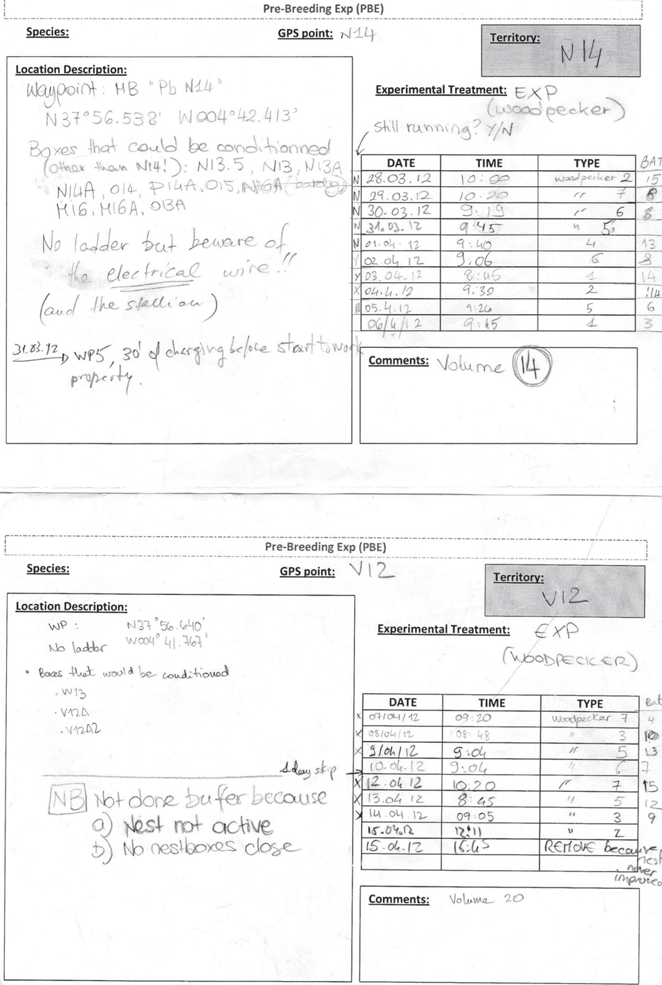 Für die Doktoranden, Assistenten und Praktikanten beginnt die Feldarbeit mit der Nestsuche. Um die richtigen Nester zu finden, müssen sie den Gesang, das Aussehen und das Verhalten der Vogelarten kennen. Dazu bekommt jeder Teilnehmer Tonaufnahmen, Fotografien und Beschreibungen zu den Vögeln, die sie im Vorhinein genau studieren müssen. Sobald ein Nest oder ein Hinweise auf ein Nest (z. B. Ein fliegender Vogel) gefunden wird, wird in einem GPS System eine Markierung gesetzt. Jede Nestmarkierung wird nach einem Code bezeichnet. Dieser Code bestehen aus Ziffern, Buchstaben und grafischen Symbolen. Er beinhaltet verschiedenartige Informationen über die Nester. Beispielsweise die Aktivität, das Stadium in dem sich die Eier befinden oder ob ein Nest ausgeraubt oder gestört wurde. Auch die Markierungen der Nester vom Vorjahr sind in diesem Kartensystem wieder zu finden. Dies erleichtert die Nestsuche. Da Gretchen verschiedene Vogelarten untersucht und an diesen jeweils verschiedene Experimente durchführt, gibt es für jede Spezies eine eigene Karte. So kann der Überblick bewahrt werden. Die Orte, an denen sich Nester befinden werden zusätzlich mit Naturalien markiert. Die digitale Karte hat den Vorteil, dass sich alle Forscher die Informationen teilen und bearbeiten können, da sie gleichzeitigen Zugang haben. Zusätzlich ist in ihr auch die Topographie des Ortes dargestellt und unterstützt die Orientierung und die Wegfindung im Territorium.