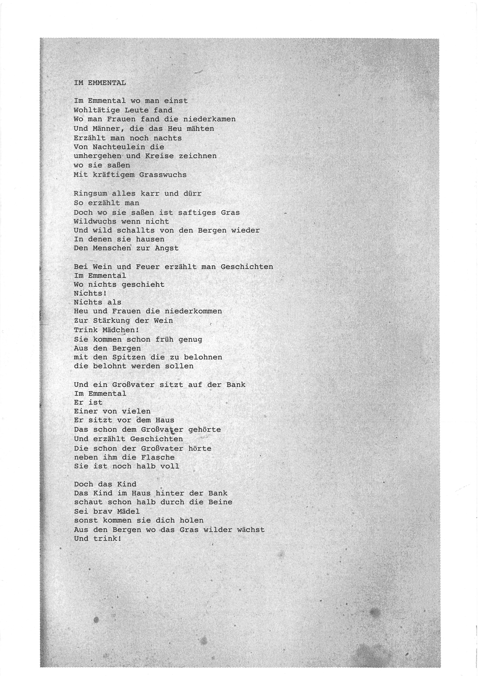 Auch für das zweite Projekt bildeten die Geschichten der Erdmännchen aus Sagenbüchern die Grundlage. Gabriella Gall, die Erdmännchen an der Universität Zürich erforscht, bearbeitete die Texte zunächst und markierte die aus ihrer Sicht relevanten Stellen. Diese Bearbeitungen wandelte Vera Buck anschließend in lyrischen Formen um und druckte sie auf Kopien aus Brehms Illustriertes Thierleben von 1864. Verwendet wurden nur die markierten Wörter, jedes Gedicht entspricht einer Sage. (Quellen: Brehm, Illustriertes Thierleben: eine allgemeine Kunde des Thierreichs, 1864; Sagen der Schweiz, von Peter Keckeis und Zwergenkönig Goldemar auf Burg Hardenstein, eine Sage aus dem Ruhrgebiet aus dem 13. Jahrhundert [Autor unbekannt])