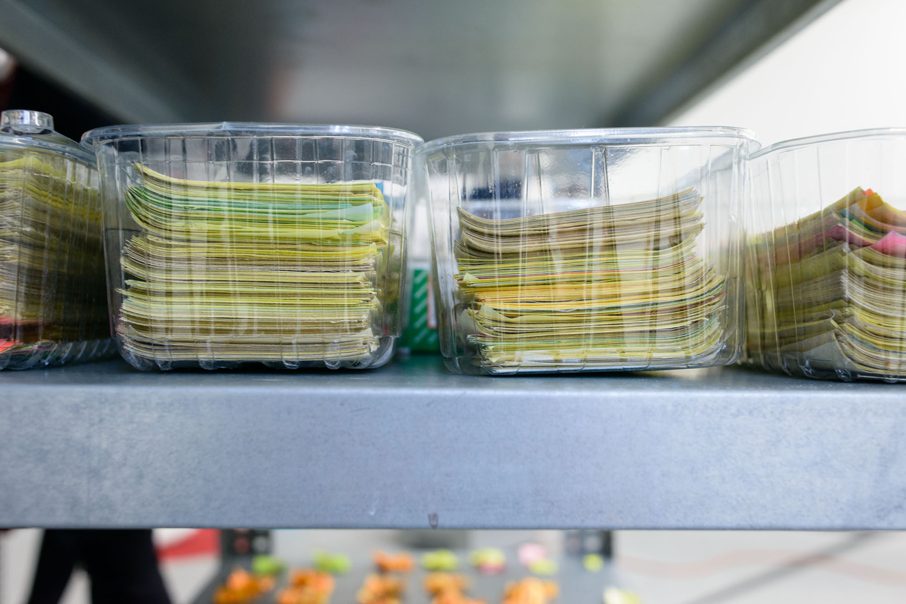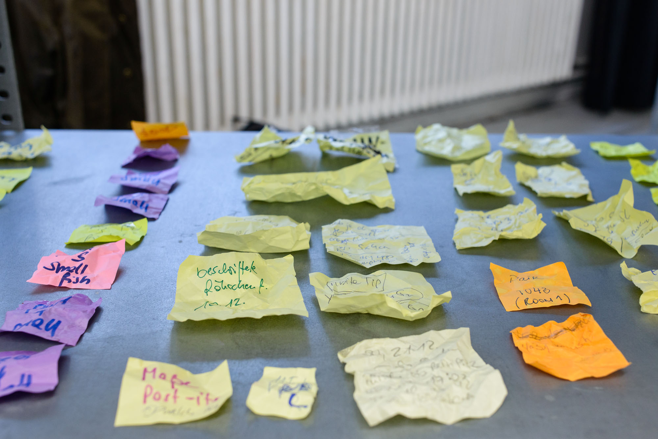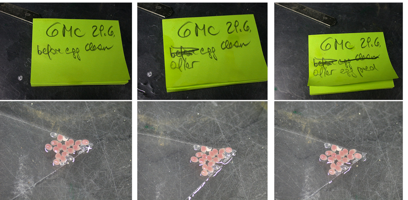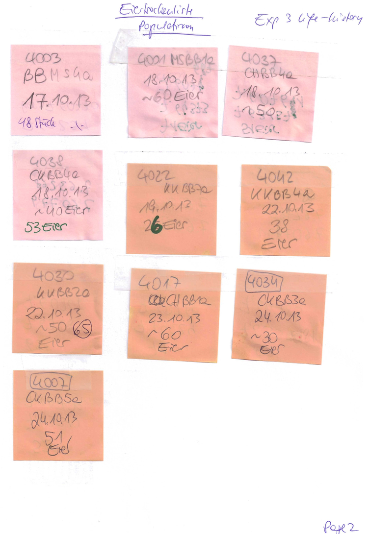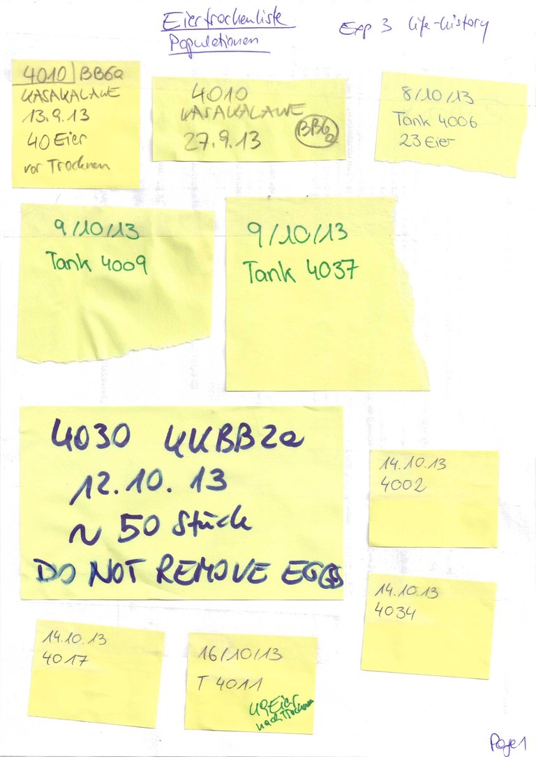 Claudia Kasper erforscht das Verhalten von Fischen. Die Ergebnisse ihrer Beobachtungen schreibt sie auch auf post-it-Aufkleber. Für die Experimente mit den Eierpopulationen ist ihr post-it-System folgendermassen: