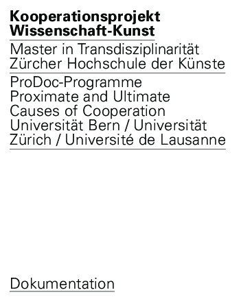 Im Kooperationsprojekt arbeiteten Studierende des Master Transdisziplinarität der Zürcher Hochschule der Künste während eines Semesters mit Doktorierenden des vom Nationalfonds geförderten ProDoc-Programms «Proximate and Ultimate Causes of Cooperation» zusammen. An diesem Programm sind For- schungsgruppen von fünf Schweizer Universitäten beteiligt, die das Kooperationsverhalten verschiedenster Lebewesen unter- suchen. Der Titel des Programms diente auch den Beteiligten als Richtschnur: Welche grundlegenden und nahe liegenden Motive gibt es für Kooperationen zwischen Wissenschaft und Kunst? Welche Anliegen betreffen möglicherweise beide Felder und wie lassen sich künstlerische Kompetenzen mit solchen der Natur- wissenschaften für beide Seiten gewinnbringend zusammen führen? Bezugnahmen zwischen KünstlerInnen/GestalterInnen und NaturwissenschaftlerInnen wurden in kleinen Teams erprobt und diskutiert. Dabei ging es um erste Annäherungen, das Entdecken gemeinsamer Interessen und das Entwerfen von Projektideen, die nur im Dialog entwickelt werden können. Dozierende: Hannes Rickli und Irene Vögeli (ZHdK, MA Transdisziplinarität); Michael Griesser und Valentina Rossetti (Universität Zürich, Anthropologisches Institut) Begleitet wurde das Kooperationsprojekt von vier Abend- veranstaltungen (Kolloquium), in welchen Expertinnen und Experten aus Künsten und Wissenschaften über Chancen und Schwierigkeiten von Kooperationen der beiden Felder verhandelten. Beteiligt waren: Jens Badura, Dr. habil., Philosoph, Leiter des Forschungsschwerpunkts «Performative Praxis» am Institute for the Performing Arts and Film (IPF) der ZHdK; Florian Dombois, Prof., Künstler und Leiter des Forschungsschwer- punkts Transdisziplinarität der ZHdK; Michael Griesser, Zoologe, Prof., Anthropologisches Institut der Universität Zürich und Leiter des ProDoc-Programms «Ultimate and Proximate Causes of Cooperation»; Christoph Hoffmann, Prof. für Wissenschafts- forschung Universität Luzern; Luzia Hürzeler, Künstlerin, Doktorandin an der Graduate School of the Arts der Universität Bern und der Hochschule der Künste Bern; Rachel Mader, Dr., Kunstwissenschaftlerin, Leiterin des Competence Center Kunst und Öffentlichkeit an der Hochschule Luzern, Design und Kunst; Dieter Mersch, Prof. Dr., Philosoph, Leiter des Instituts für Theorie (ith) der ZHdK; Patrick Müller, Prof., Musik- und Literaturwissenschaftler, Leiter Master Transdisziplinarität der ZHdK; Hans-Jörg Rheinberger, Direktor am Max-Planck-Institut für Wissenschaftsgeschichte in Berlin; Hannes Rickli, Prof., Künstler und Dozent ZHdK; Carel van Schaik, Zoologe, Professor und Direktor des Instituts und des Museums für Anthropologie der Universität Zürich.