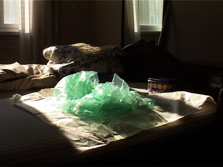 E: One day when I came into the room, a plastic sheet had been thrown over the bed. It was weird, because it somehow turned the bed into the deceased person.
