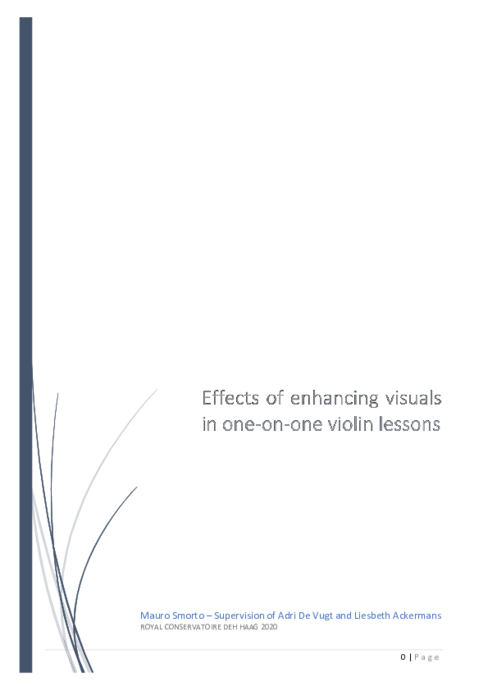 Starting from my personal teaching experience, I have been studying the effect of visual instructions on my violin pupils. With a detailed analysis of the interactions between students and teacher and the help of 36 observation sheets, I could finally see the effects of enhancing visuals on student’s musical learning. All conclusions were drawn after taking into account specific studies mentioned in the theoretical framework and with respect to the observations made by three external experts. This research found further evidence of the link between visualization and critical thinking as well.