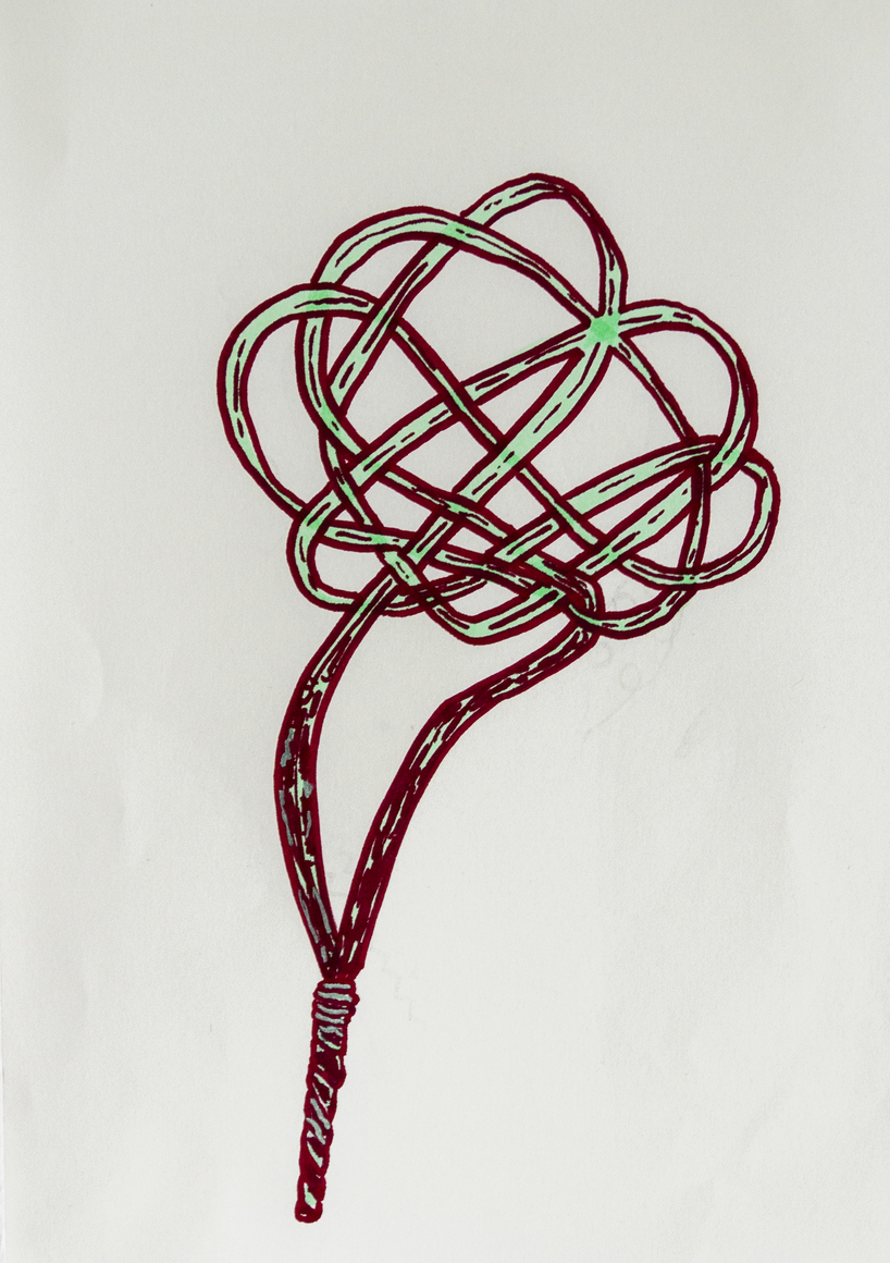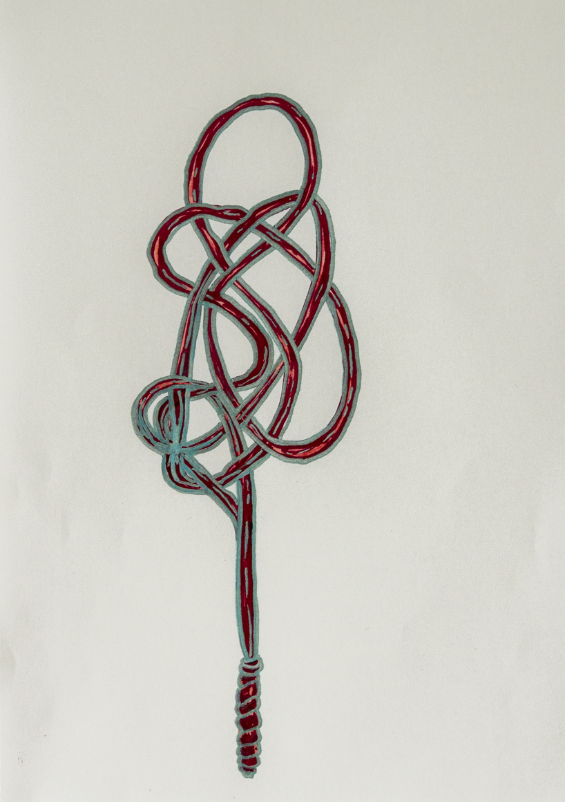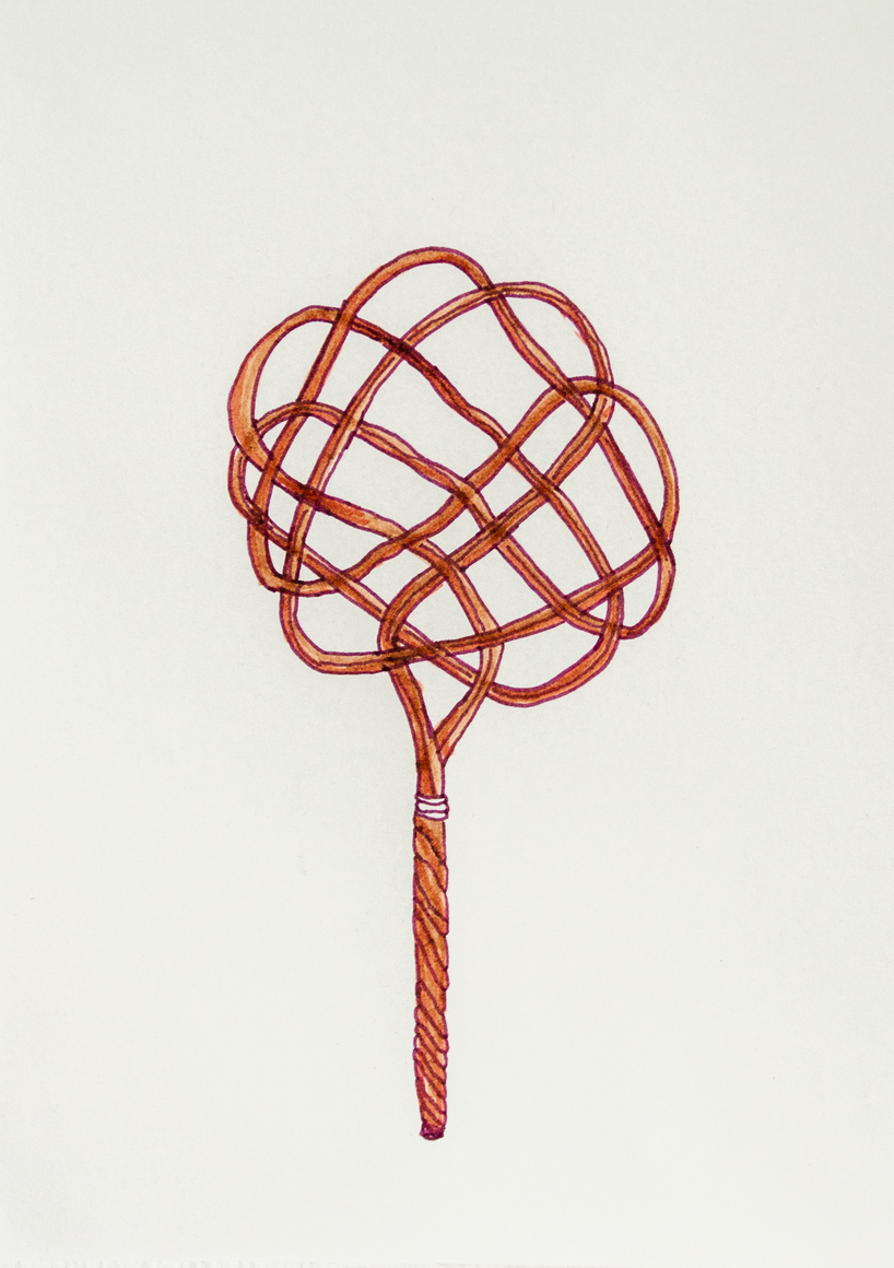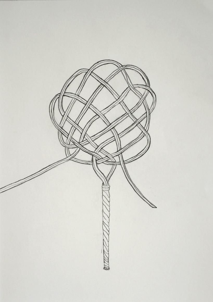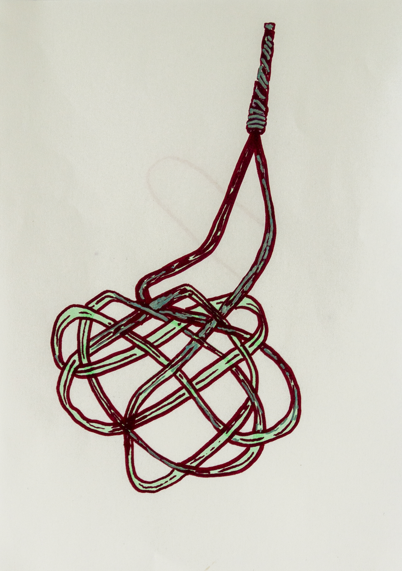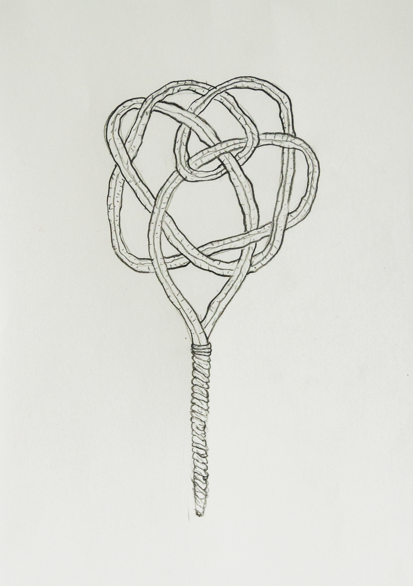 The courtyard, laundry room, and areas for beating carpets are collective facilities in the private sphere of the home. In Stockholm you can find carpet hangers in connection to many apartment blocks even though they are very seldom used nowadays. The act of whipping carpets is an act that aims to get rid of the dirt – the remnants of life. Cleaning is a repetitive work, where something needs to be done over and over again without it producing something new. The project Piskan ställningen consists of an essay, sound pieces, and sketches in different materials and is divided into three parts; the one who beats, the beater itself, and that which constitutes a stand for the beating. The various associations to the carpet hanger and the carpet beater form the basis of the project that centres around questions concerning repetition and productivity, place and time, the boundary between the public and the domestic sphere, and how dangerous the pursuit of alleged purity, hygiene, science, and light can be. Through text, sound and images, personal and collective memories, and the object's associations regarding reproductive labour, city planning, violence, the welfare project, and childish games are intertwined. The material also contains other associations to control and power – with the whip as a means of threat and punishment, and an exploration of different forms of emptiness in relation to architecture, social structures, and mental space. Through a younger and an elderly woman's narrative voice, we follow an associative thought chain that interweaves the public, the domestic, and a bodily sphere. The setting is a society where she comes home from work to yet another form of monotonous routines, where cars get burned down, and tables are placed under vases, whilst someone has been digging a hole down in the city. Through sketches in different materials, I approach the carpet beater by exploring its shape. My attempts to repeat the knots lead to a series of variations on the memory of whips where mistakes constitute the basis of new forms. In the project repetition and variations in sound, text, and drawing becomes another way of approaching repetitive work