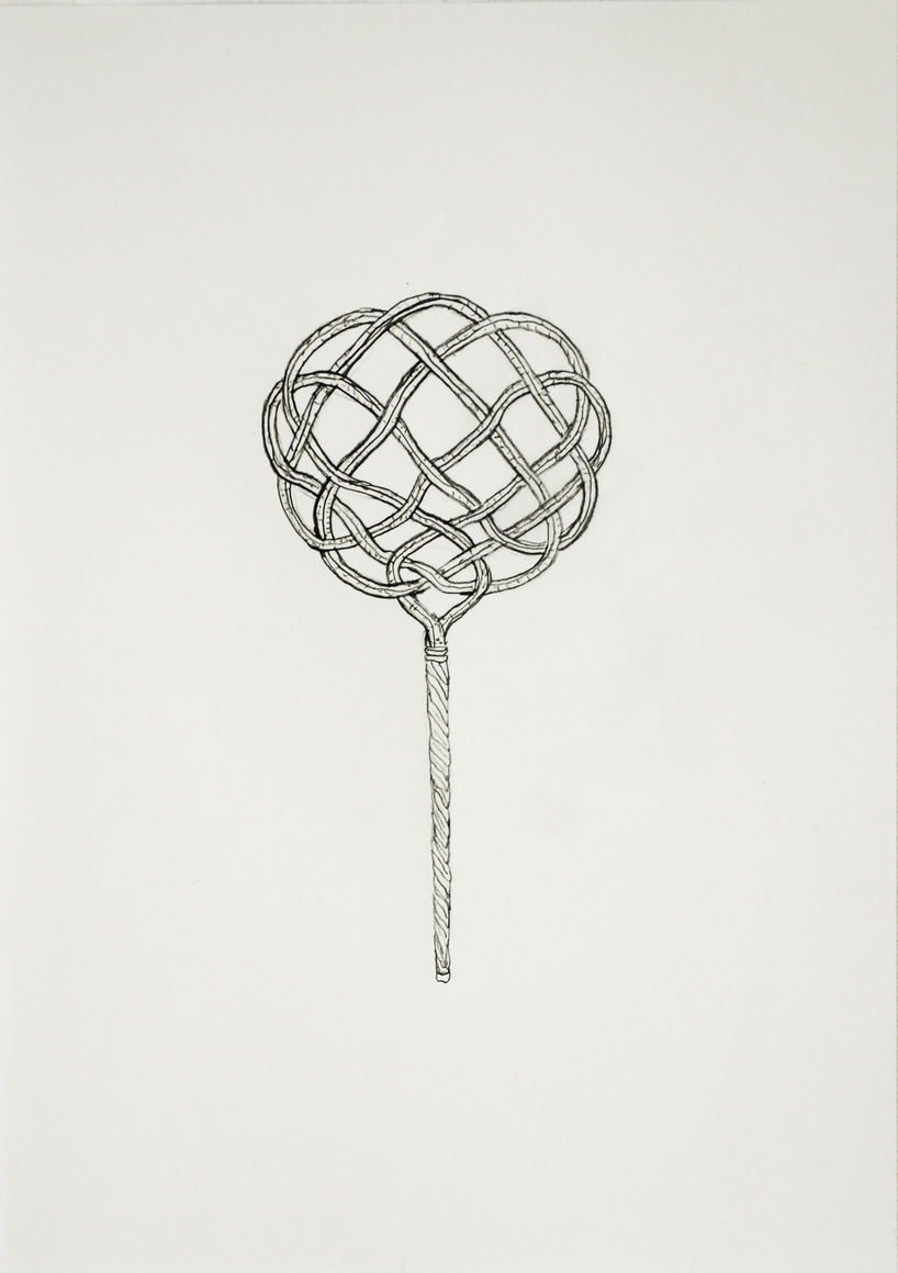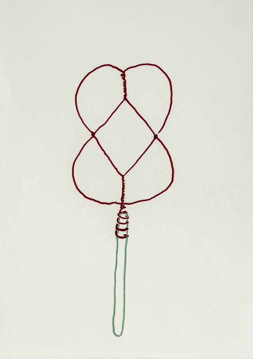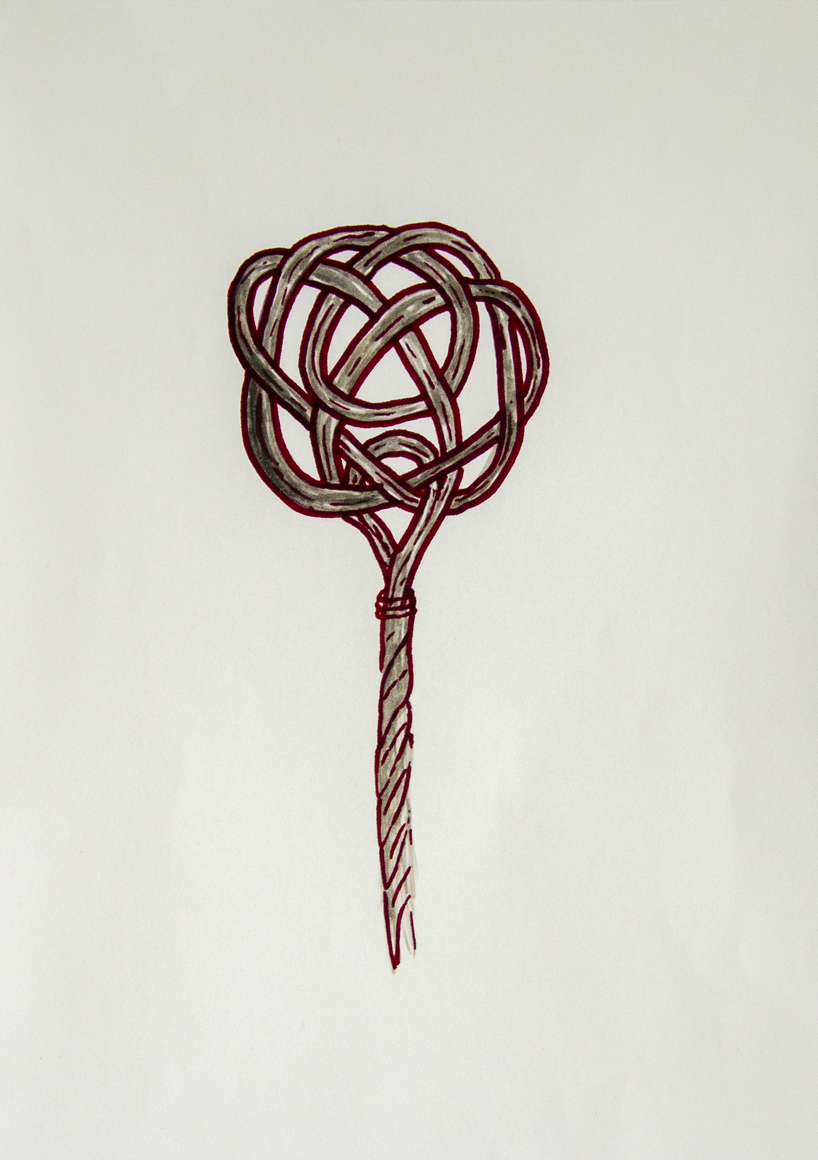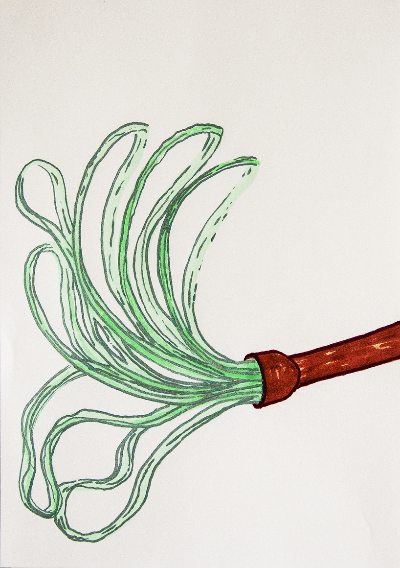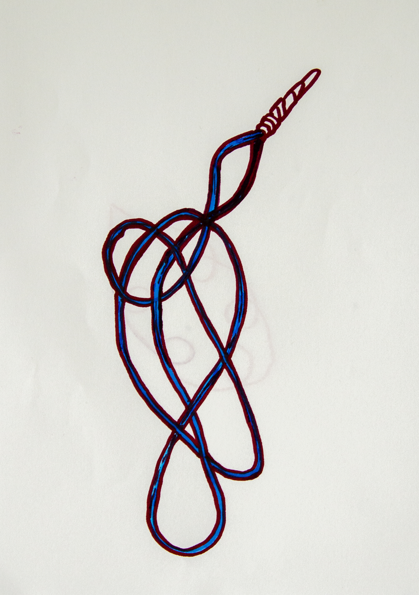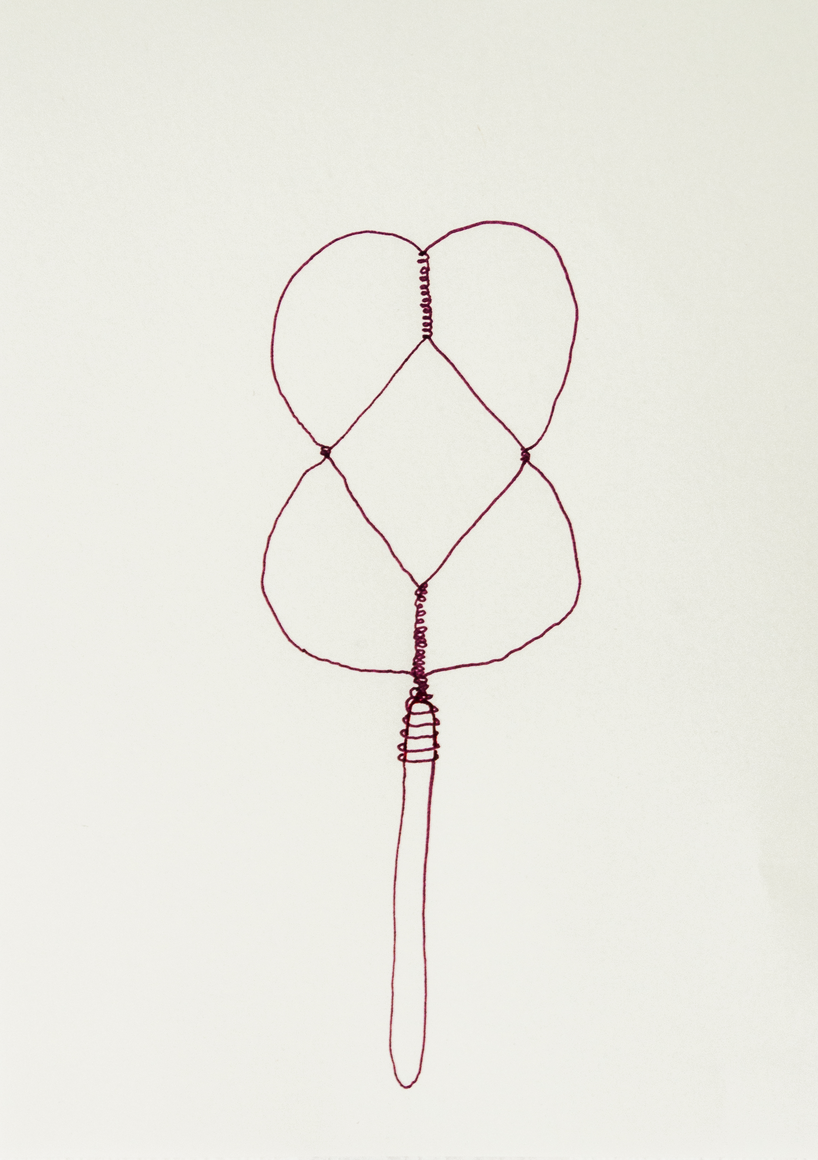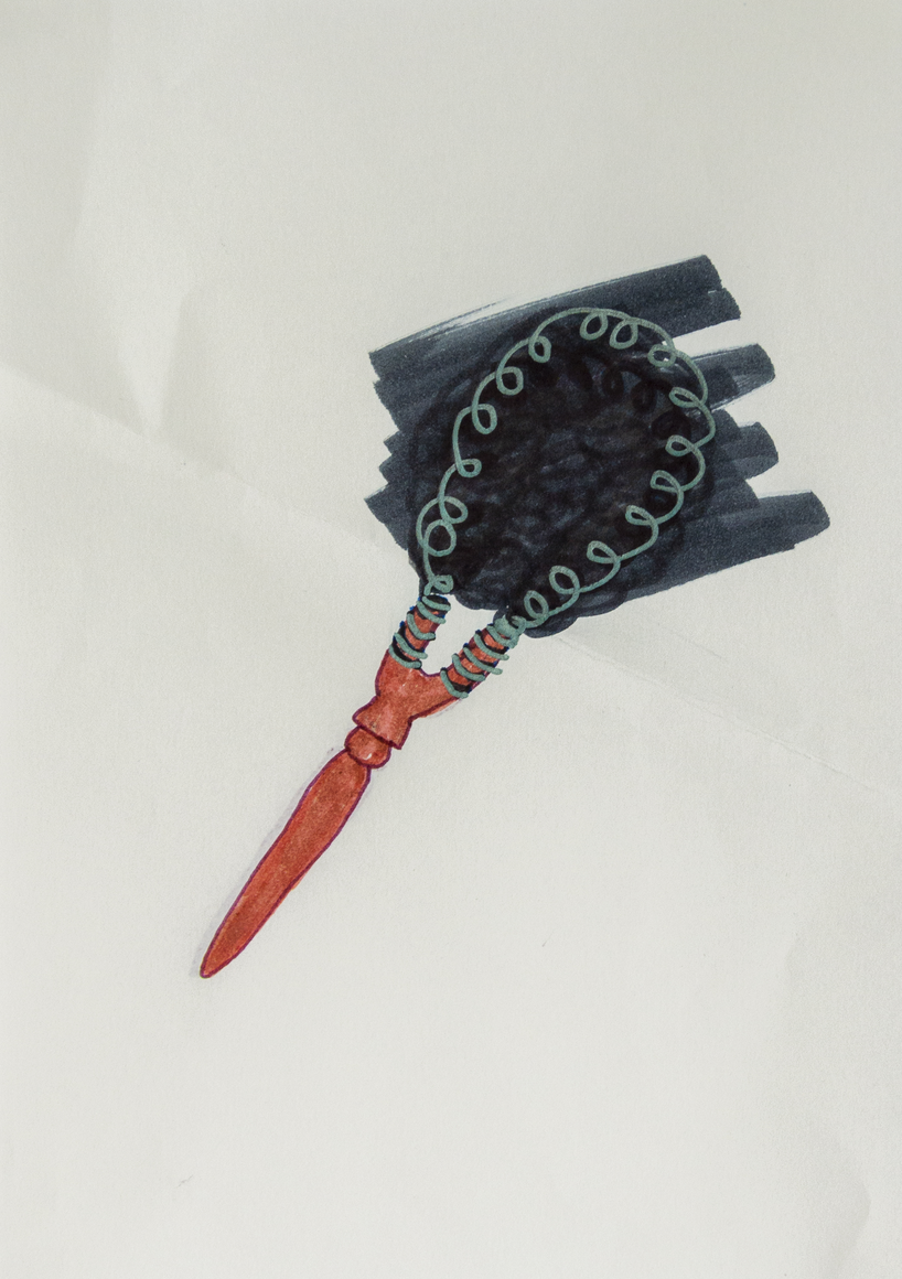 The courtyard, laundry room, and areas for beating carpets are collective facilities in the private sphere of the home. In Stockholm you can find carpet hangers in connection to many apartment blocks even though they are very seldom used nowadays. The act of whipping carpets is an act that aims to get rid of the dirt – the remnants of life. Cleaning is a repetitive work, where something needs to be done over and over again without it producing something new. The project Piskan ställningen consists of an essay, sound pieces, and sketches in different materials and is divided into three parts; the one who beats, the beater itself, and that which constitutes a stand for the beating. The various associations to the carpet hanger and the carpet beater form the basis of the project that centres around questions concerning repetition and productivity, place and time, the boundary between the public and the domestic sphere, and how dangerous the pursuit of alleged purity, hygiene, science, and light can be. Through text, sound and images, personal and collective memories, and the object's associations regarding reproductive labour, city planning, violence, the welfare project, and childish games are intertwined. The material also contains other associations to control and power – with the whip as a means of threat and punishment, and an exploration of different forms of emptiness in relation to architecture, social structures, and mental space. Through a younger and an elderly woman's narrative voice, we follow an associative thought chain that interweaves the public, the domestic, and a bodily sphere. The setting is a society where she comes home from work to yet another form of monotonous routines, where cars get burned down, and tables are placed under vases, whilst someone has been digging a hole down in the city. Through sketches in different materials, I approach the carpet beater by exploring its shape. My attempts to repeat the knots lead to a series of variations on the memory of whips where mistakes constitute the basis of new forms. In the project repetition and variations in sound, text, and drawing becomes another way of approaching repetitive work