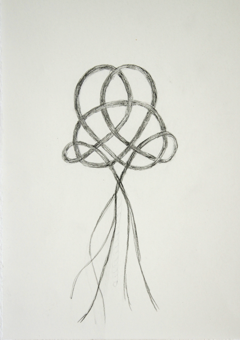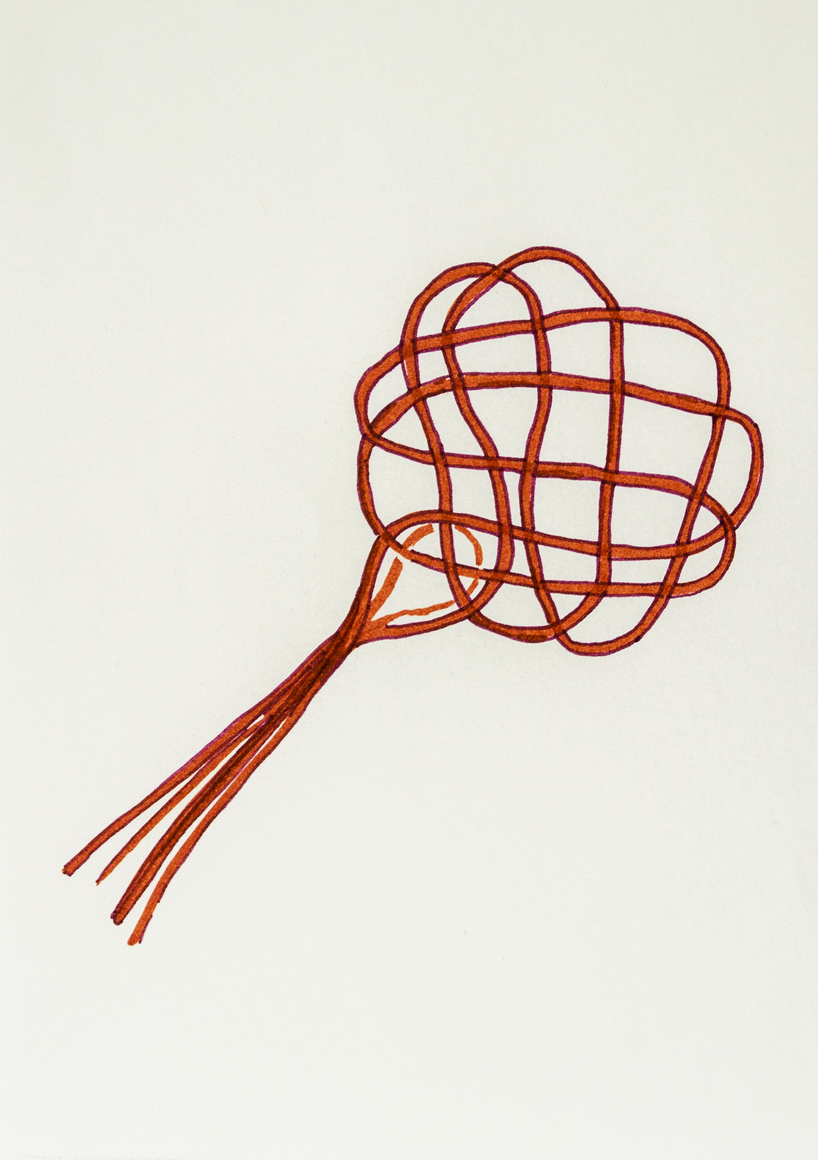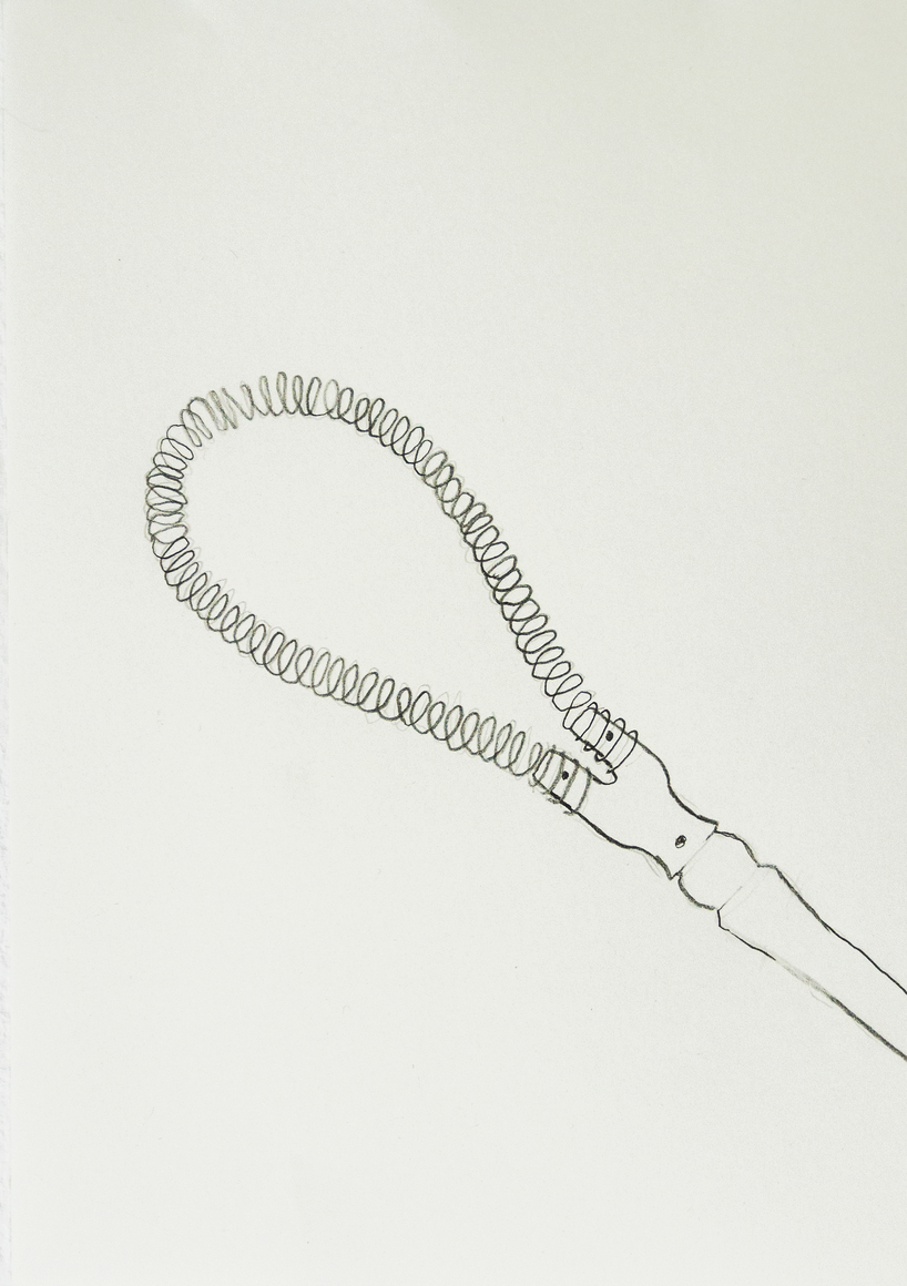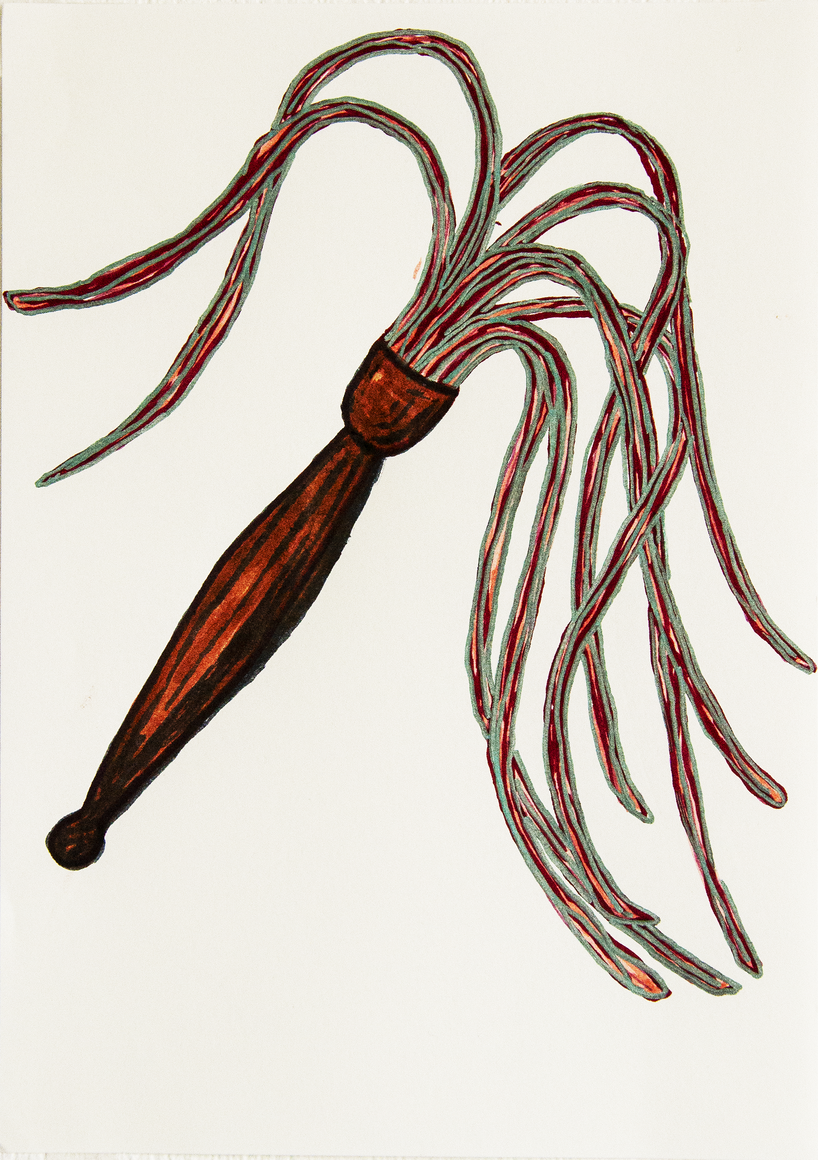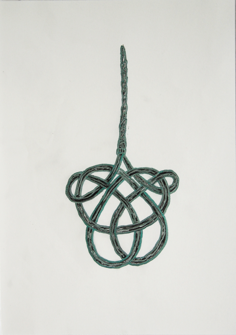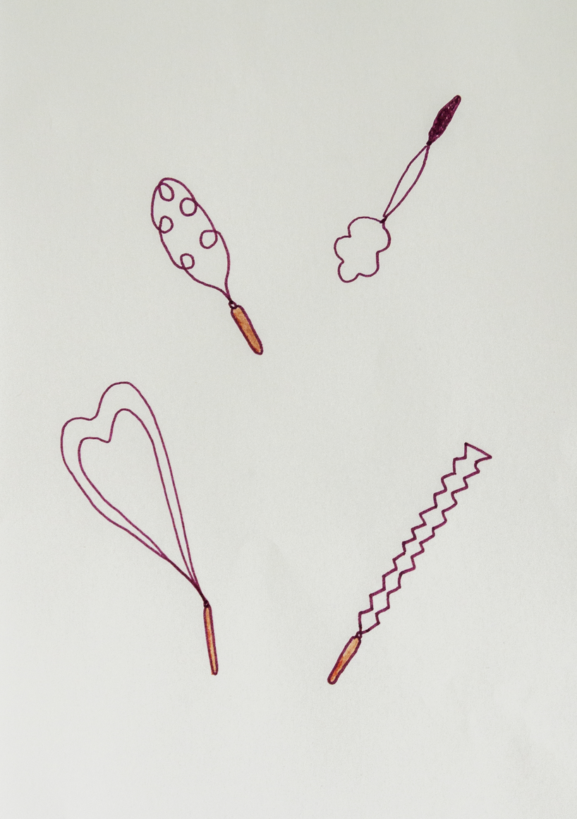 The courtyard, laundry room, and areas for beating carpets are collective facilities in the private sphere of the home. In Stockholm you can find carpet hangers in connection to many apartment blocks even though they are very seldom used nowadays. The act of whipping carpets is an act that aims to get rid of the dirt – the remnants of life. Cleaning is a repetitive work, where something needs to be done over and over again without it producing something new. The project Piskan ställningen consists of an essay, sound pieces, and sketches in different materials and is divided into three parts; the one who beats, the beater itself, and that which constitutes a stand for the beating. The various associations to the carpet hanger and the carpet beater form the basis of the project that centres around questions concerning repetition and productivity, place and time, the boundary between the public and the domestic sphere, and how dangerous the pursuit of alleged purity, hygiene, science, and light can be. Through text, sound and images, personal and collective memories, and the object's associations regarding reproductive labour, city planning, violence, the welfare project, and childish games are intertwined. The material also contains other associations to control and power – with the whip as a means of threat and punishment, and an exploration of different forms of emptiness in relation to architecture, social structures, and mental space. Through a younger and an elderly woman's narrative voice, we follow an associative thought chain that interweaves the public, the domestic, and a bodily sphere. The setting is a society where she comes home from work to yet another form of monotonous routines, where cars get burned down, and tables are placed under vases, whilst someone has been digging a hole down in the city. Through sketches in different materials, I approach the carpet beater by exploring its shape. My attempts to repeat the knots lead to a series of variations on the memory of whips where mistakes constitute the basis of new forms. In the project repetition and variations in sound, text, and drawing becomes another way of approaching repetitive work