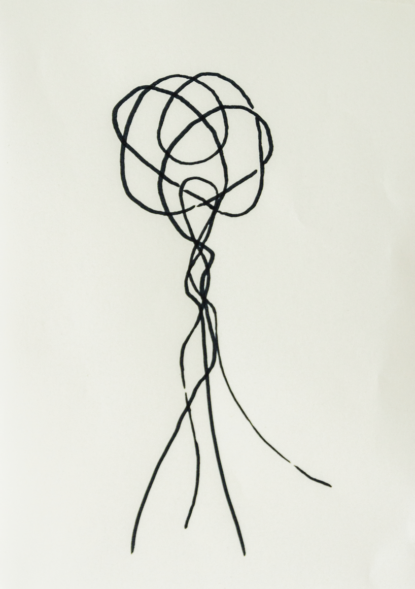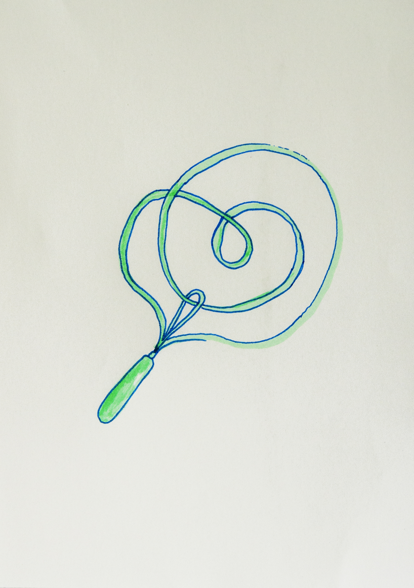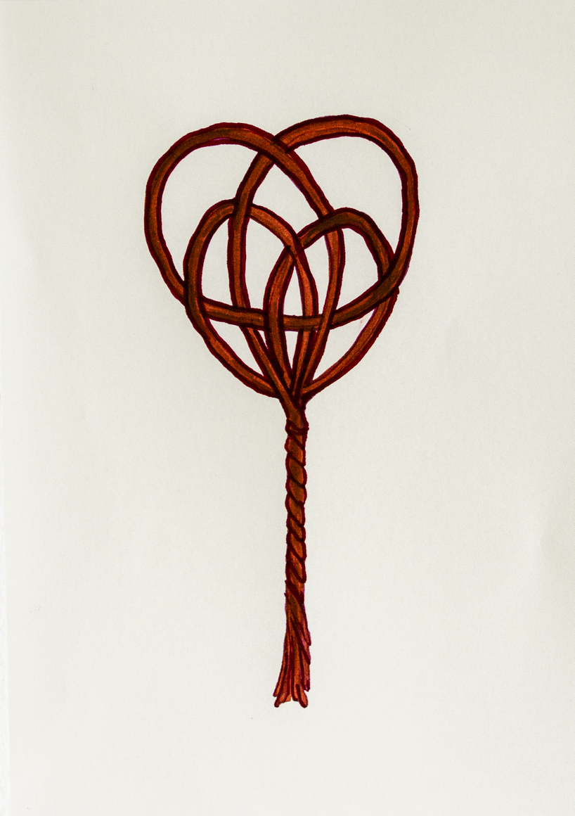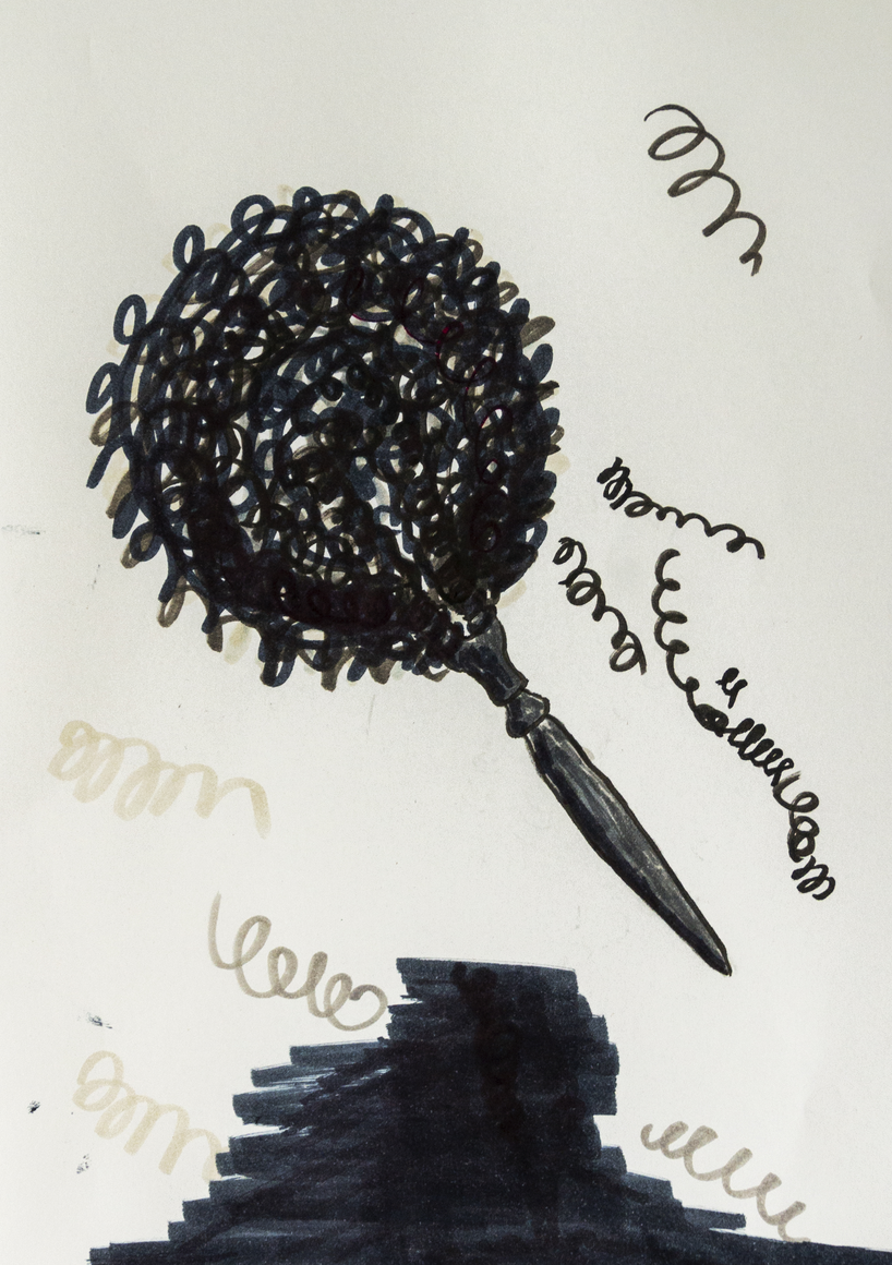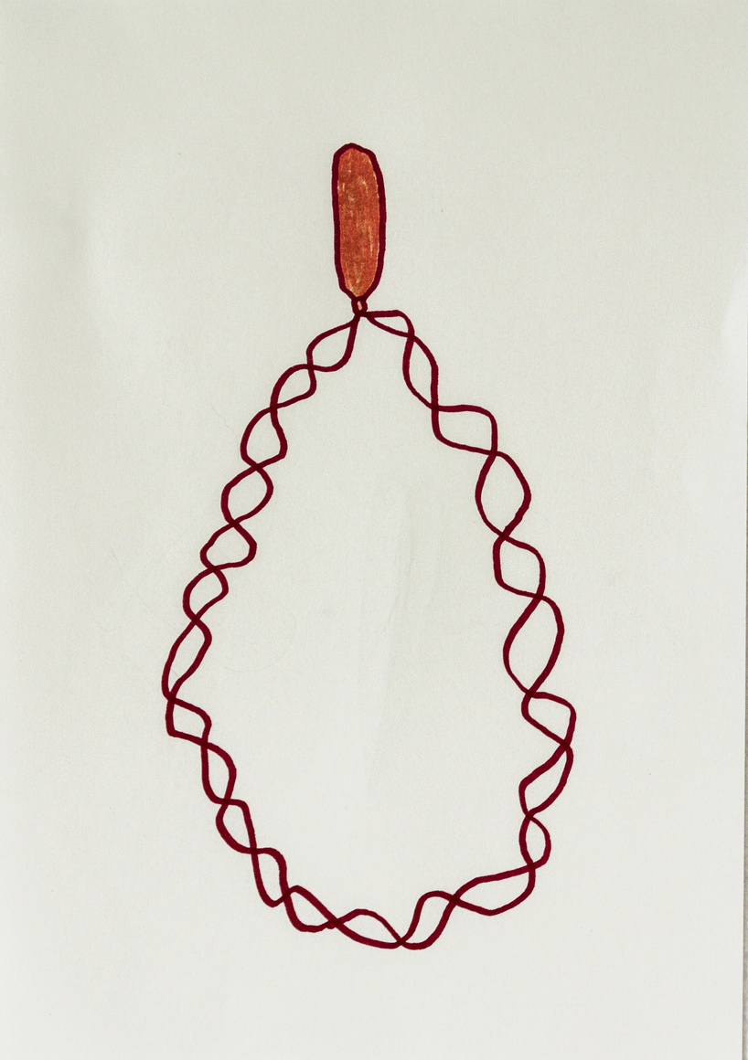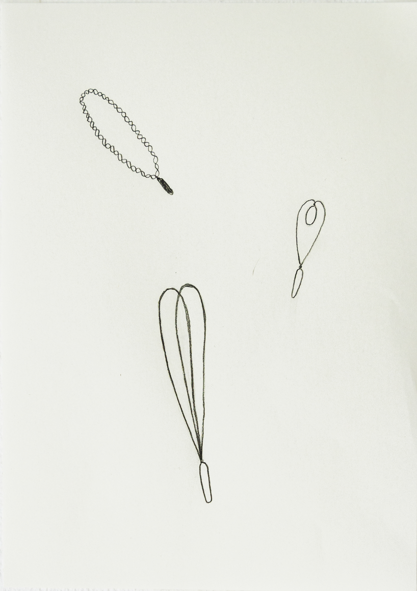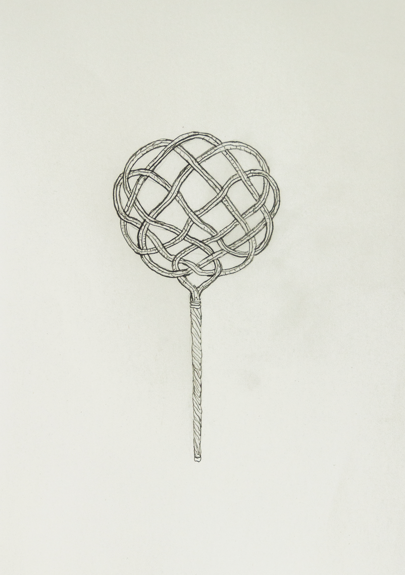 The courtyard, laundry room, and areas for beating carpets are collective facilities in the private sphere of the home. In Stockholm you can find carpet hangers in connection to many apartment blocks even though they are very seldom used nowadays. The act of whipping carpets is an act that aims to get rid of the dirt – the remnants of life. Cleaning is a repetitive work, where something needs to be done over and over again without it producing something new. The project Piskan ställningen consists of an essay, sound pieces, and sketches in different materials and is divided into three parts; the one who beats, the beater itself, and that which constitutes a stand for the beating. The various associations to the carpet hanger and the carpet beater form the basis of the project that centres around questions concerning repetition and productivity, place and time, the boundary between the public and the domestic sphere, and how dangerous the pursuit of alleged purity, hygiene, science, and light can be. Through text, sound and images, personal and collective memories, and the object's associations regarding reproductive labour, city planning, violence, the welfare project, and childish games are intertwined. The material also contains other associations to control and power – with the whip as a means of threat and punishment, and an exploration of different forms of emptiness in relation to architecture, social structures, and mental space. Through a younger and an elderly woman's narrative voice, we follow an associative thought chain that interweaves the public, the domestic, and a bodily sphere. The setting is a society where she comes home from work to yet another form of monotonous routines, where cars get burned down, and tables are placed under vases, whilst someone has been digging a hole down in the city. Through sketches in different materials, I approach the carpet beater by exploring its shape. My attempts to repeat the knots lead to a series of variations on the memory of whips where mistakes constitute the basis of new forms. In the project repetition and variations in sound, text, and drawing becomes another way of approaching repetitive work