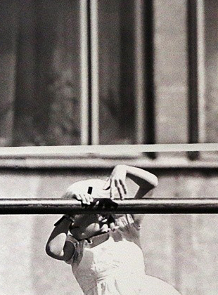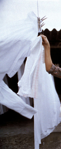 de blickar mellan lakanen som torkar medan paraden går genom staden.