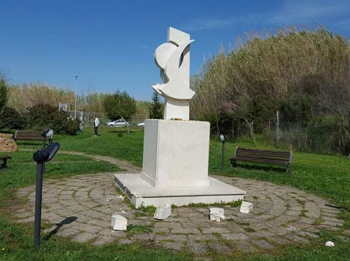 Monument to Pier Paolo Pasolini at the Idroscalo di Ostia, periphery of Rome. The sculpture marks the place where Pasolini was found murdered in the night between 1 and 2 November 1975. The photograph shows the monument after it was vandalised by an extreme-right group in 2016.