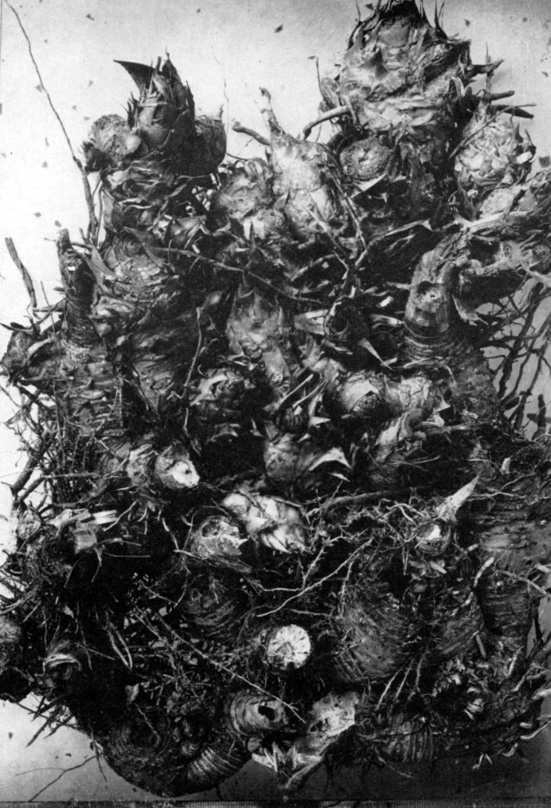 [a] The photograph shows a rhizome of giant cane. (Perdue 1958: fig. 3). Quite to the point, Deleuze remarks that 'the rhizome includes the best and the worse' (Deleuze and Guattari 1987: 7). The rhizomatic-arborescent structure of artistic research, and of this exposition in particular, is illustrated by 'the delicate inter-twinning of the roots of ten young Scots pine trees.' (De Assis 2018: 33). Elaborating on this diagram, the rhizome (epistemic practice) is an intermediate structure between the pine trees (propositional knowledge) and the earth in which they are rooted (practice). In the photograph of the giant cane, one can notice several roots that broke when the rhizome was extracted from the ground, as well as small roots still clinging to the soil in which they were growing.