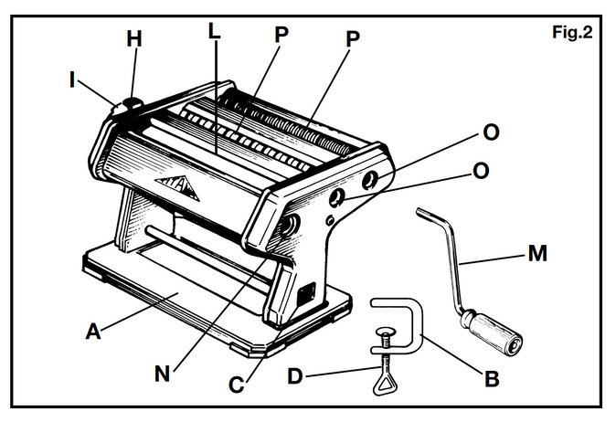 [2] Imperia started to manufacture dough sheeters in Moncalieri (Torino) in 1932, with an eye to the growing US market of Italian emigration (Tgcom24 2014). The iconic Sfogliatrice Imperia mod. Titania (Imperia 2009: 4, fig.2) used by Signor Olivieri has been in production since the 70s. The diagram shows the knob (I), release lever (H) and the rollers (L) mentioned in the text. A parallel is suggested with the hand drawn diagrams illustrating the Trattato. See fig. [a].
