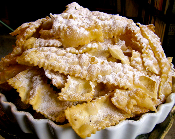 [3] The first written recipe for these traditional Carnival fritters can be found in the Libro de arte coquinaria (1450-67) where they are called as 'frictelle piene di vento':