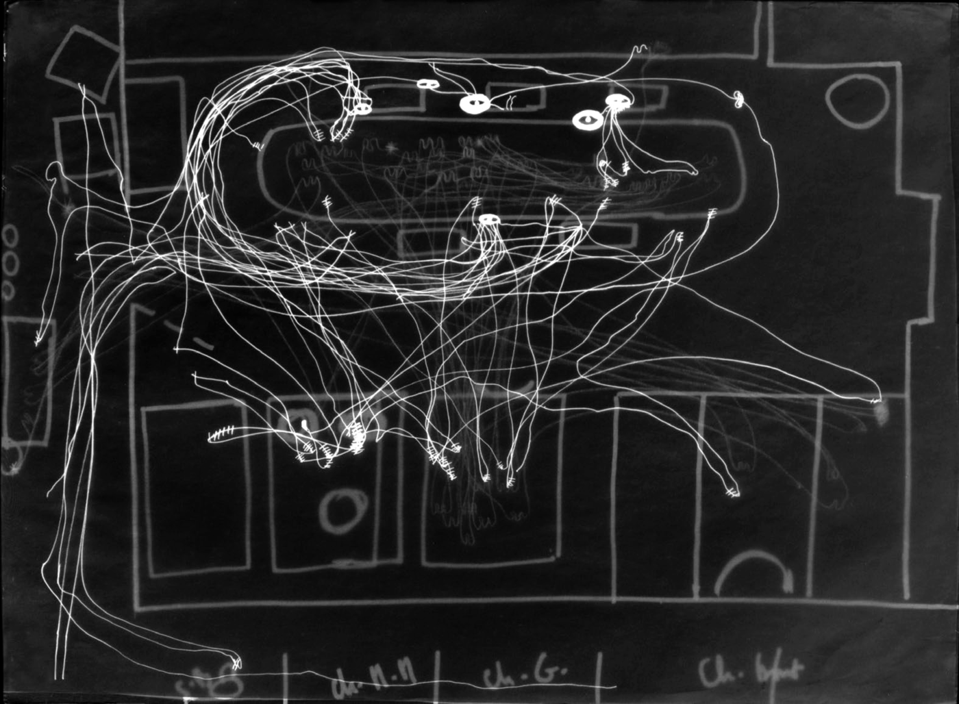 The wander lines are drawn in India ink on tracings superimposed on the background map. They transcribe the movements of the three autistic children while bread is being made. The “eyes” mark the children’s places around the table. The “hands” are recognizable, as well as the strings of saliva (with which one of the children is playing), represented by little wavelets."