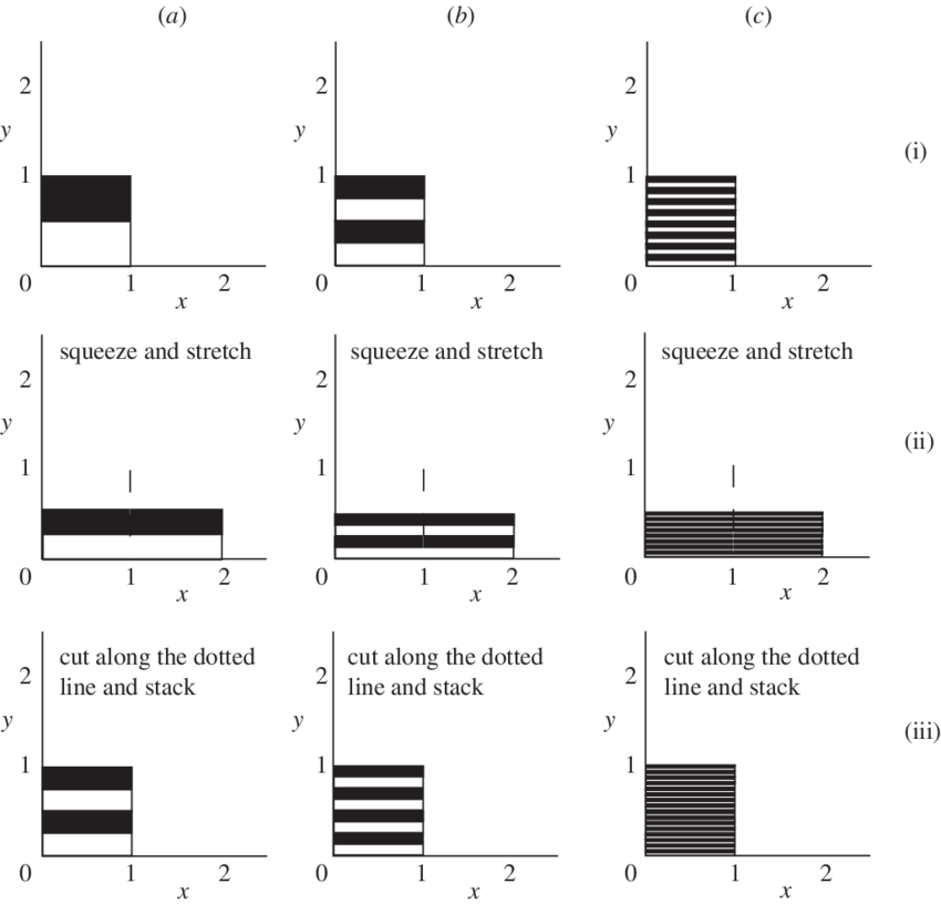 In 'N as for Neurology' Deleuze says that thinking and kneading are processes of transformation that bring distant points into proximity and puts distance between contiguous points. Thus thinking in the brain creates both the concepts of philosophy and sensations (percepts and affects) of art (Stivale 2008: 24). The 'baker's transformation' shown in figure (Wiggins and Ottino 2004: 948 fig. 1) diagrammatises Signor Olivieri's material thinking across cooking, writing and refacing and. See fig. [e].