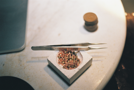 Old void copper coins, copper sheet, copper speckles, transducer, effects, AI-modelled voice narration and laptop.