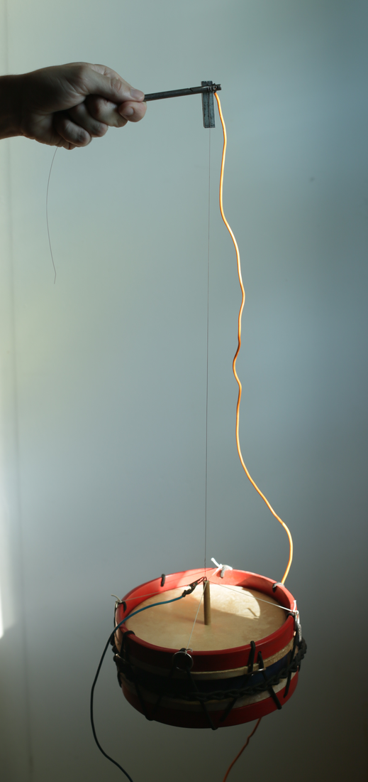 A metal string, tighten by the weight of a drum is connected to the output of an amplifier. A microphone connected to this amplifier feeds the sound of the string back into itself as analog signal which reacts like a non-linear diffuser. The drum is the acoustic medium between the string and the microphone. Different positions result to diverse resonances of the feedback.