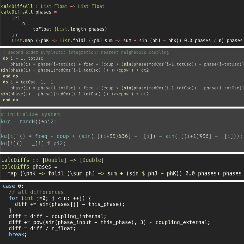 def ph[6], freq, coup;ph[i] = randH() * pi2; # starting conditionfreq = 4.0;coup = 0.1;# Kuramoto with nearest neighbors couplingph[i]'() = freq + coup * (sin(_[(i+1)%6] - _[i]) + sin(_[(i+5)%6] - _[i]));ph[i]() = _[i]%pi2;# audification: sonify with sharp gaussian pulses multiplied with for a little individual 'coloring' and to facilitate spatial spreadingout[i]() = gauss(100000.0, sin(ph[i])) * noise();{kind: code, function: experiment, keywords: [synchronization, rhythm, entrainment, Kuramoto, patterns, oscillation, phase, audification, coupling]}---