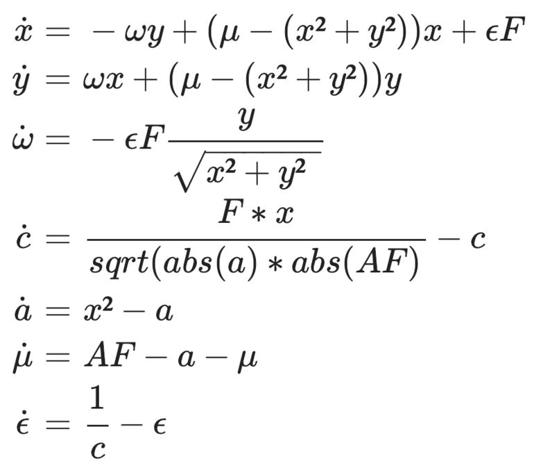 In the third iteration, the online installation we have devised a modified frequency adaptive Hopf oscillator. This more complicated version allows for quicker and more precise frequency adaptation as well as amplitude adaptation. The corresponding system may be written as below. In this formulation the term "AF" stands for the autocorrelation of the input signal. As before, also in this case we have transposed the system into a Supercollider Ugen: the code can be found here.