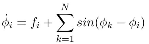 The so-called Kuramoto model, named after physicist Yoshiki Kuramoto, is one of the most known and interesting mathematical models formulating synchronization phenomena. It is still one of the most used models, applied to the study of biological phenomena as for instance the emergence of circadian rhythms or in study of synchronization patterns in the human brain. The model as a very compact and clear formulation (see below). It formulates the behavior of a system of N coupled oscillators. Each i-th oscillator is in this case formulated in terms of the variation of its phase. The phase variation depends on a constant f, the frequency of the oscillator and one interaction term. That is, in the Kuramoto model, each oscillator interacts with all other oscillator in the system through the sine of their phase difference.