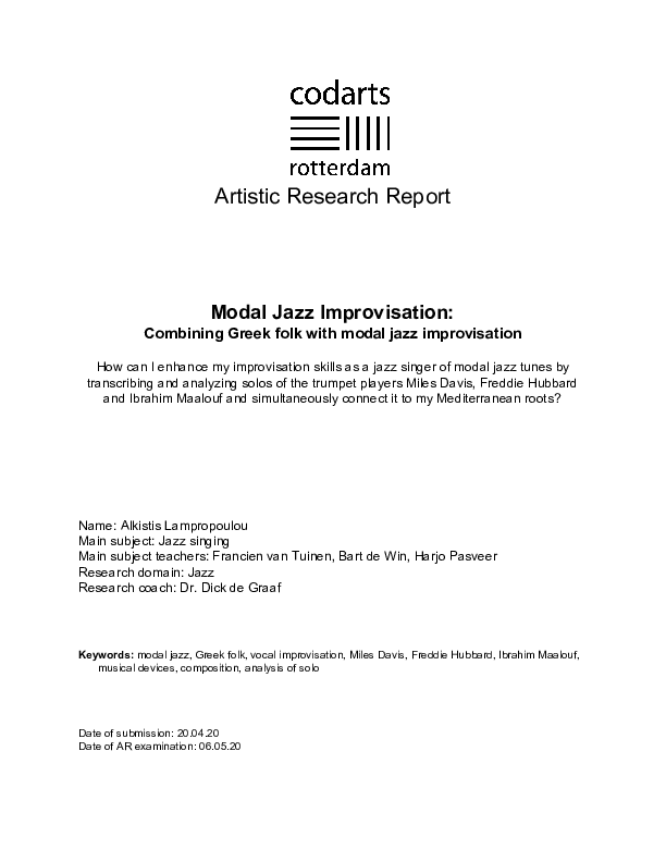 My personal striving for more freedom regarding melodic and rhythmic aspects in improvisation and less emphasis on functional harmony, led me to the exploration of modal jazz. At the first cycle of my research, I studied two legendary trumpet players Miles Davis and Freddie Hubbard in order to learn different techniques of developing a modal jazz solo. Through this journey, I discovered a strong connection to my Greek roots. Greek music is modal and thus the idea of combining the two worlds seemed obvious. For the second cycle of my research, I studied the French-Lebanese trumpet player Ibrahim Maalouf. Maalouf combines his Arabic roots with modal jazz and therefore he was a great source of inspiration to me. By arranging Greek folk songs with jazz elements and adding modal jazz improvisation to my Greek folkloric sound, I found an interesting way to combine my roots with jazz music. During my research I received valuable feedback from my research coach Dr. Dick de Graaf, my main subject teachers Bart de Win, Francien van Tuinen, Harjo Pasveer as well as from important experts Jarmo Hoogendijk, Tineke Postma, Mark van Roon, Stefan Lievestro and Eren Aksahin.