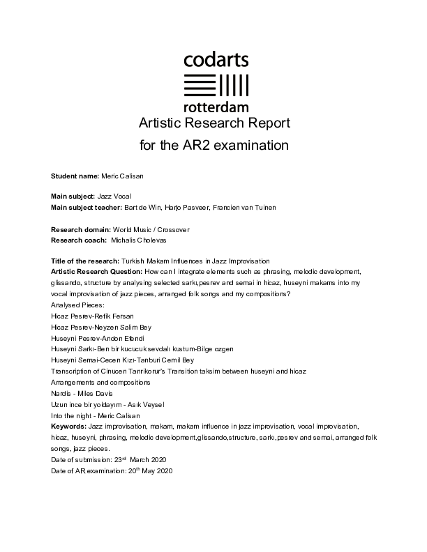 Improvisation, the art of creating at the moment, is the main reason that I started singing jazz. It allows me to express my musical thoughts, while being the biggest struggle in my musicality. I was suggested by many of my mentors and colleagues that my ideas were nice but needed to be connected. These artistic needs introduced me to taksims, improvisations based on melodic development. In this research, I demonstrate how elements such as phrasing and melodic development can be integrated into vocal improvisation of jazz and arranged folk songs by analysing selected pieces in hicaz and huseyni makams. In this context, the recordings from Refik Fersan, Salim Bey, Andon Efendi, Cemil Bey and Tanrıkorur analysed and the stylistic elements implied into my daily practice with exercises. These exercises made my improvisations more solid and consistent by prioritizing melodic development. My findings, i.e. exercises and technical explanation, will help musicians, particularly vocalists who would like to apply the makam practice into their improvisation skills. By application of this process their musicianship will profit from the linear melodic approach, odd meters and the technique.