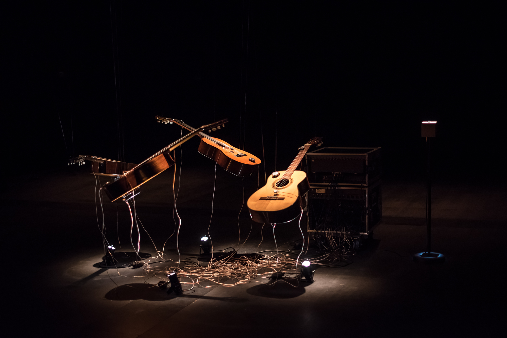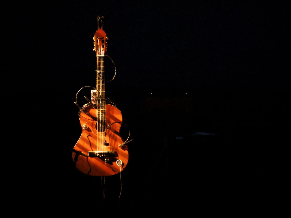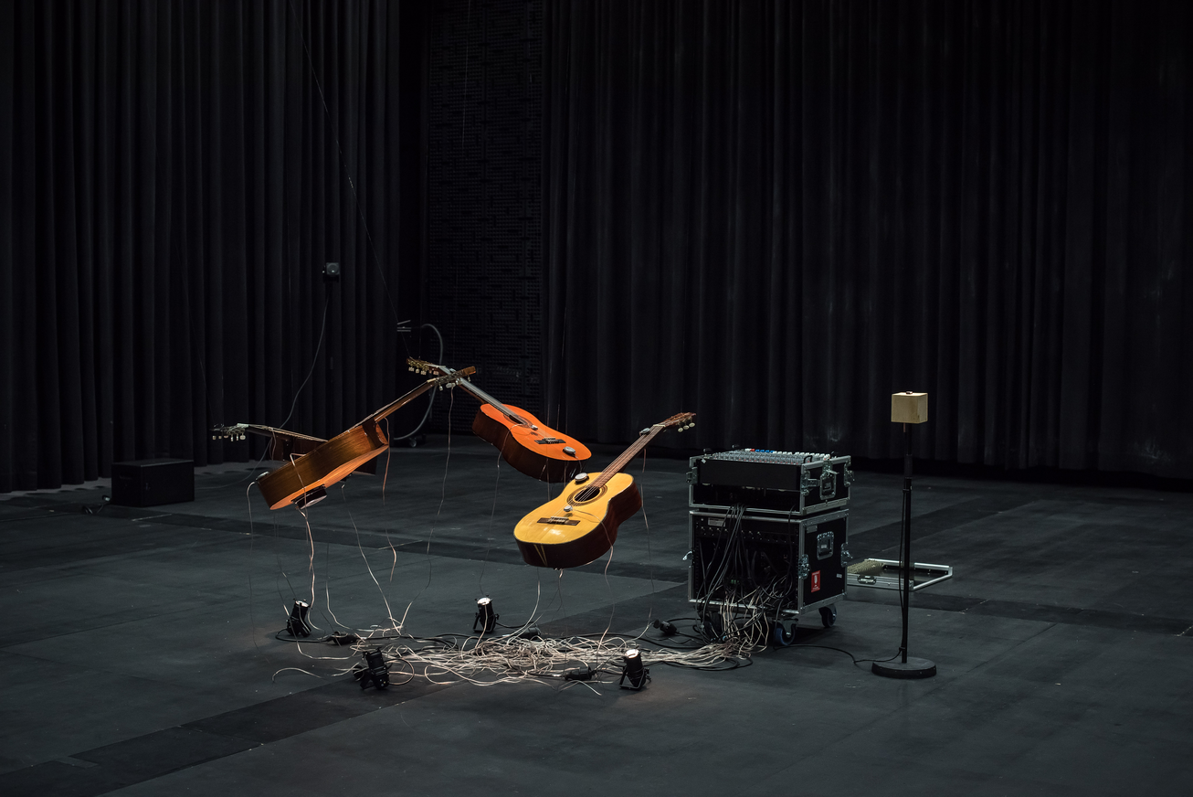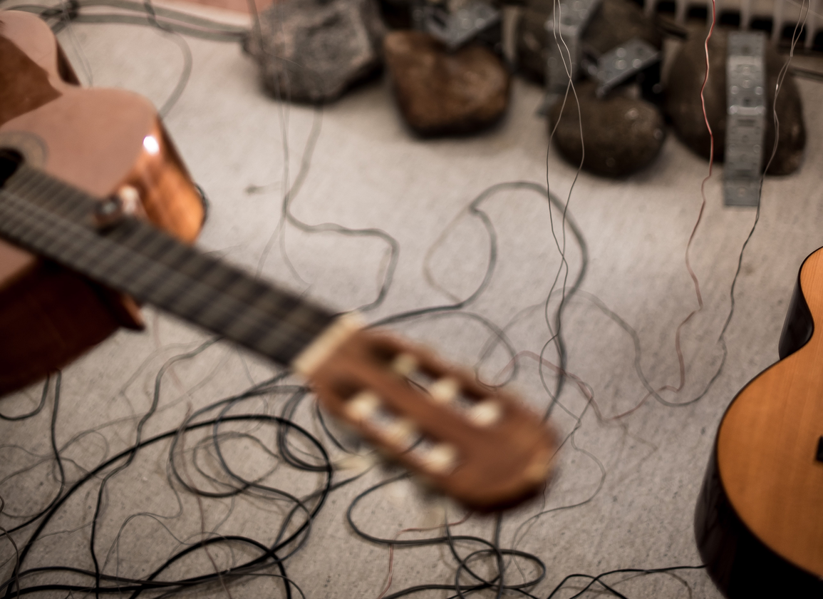 Superguitar_03 is a sound composition-installation-sculpture that studies the possibilities of adapting a traditional instrument to our contemporary world, dislocating it from its old mode of existence. It is part of a series of acoustic guitars that I have augmented, performed and composed with since 2009. These guitars question the interpretation of a traditional object, in this case a sonic object, through a reconfiguration and expansion of its aesthetical and technical resources. I do believe in the notion that art can influence society by allowing us to imagine other possible ways of being. In Superguitar_03, four acoustic guitars are suspended forming a circle and sixteen different structure-borne transducers are attached to them. The visitor entering the installation space, triggers the composition by pushing a button, and the composition plays a multichannel sound sequence that combines specific frequencies in the transducers to make the body and strings of the guitar resonate. Four speakers on the edges of the space play back a soundscape in very soft volume, inviting the audience to move closely to and far away from the sound sculpture.