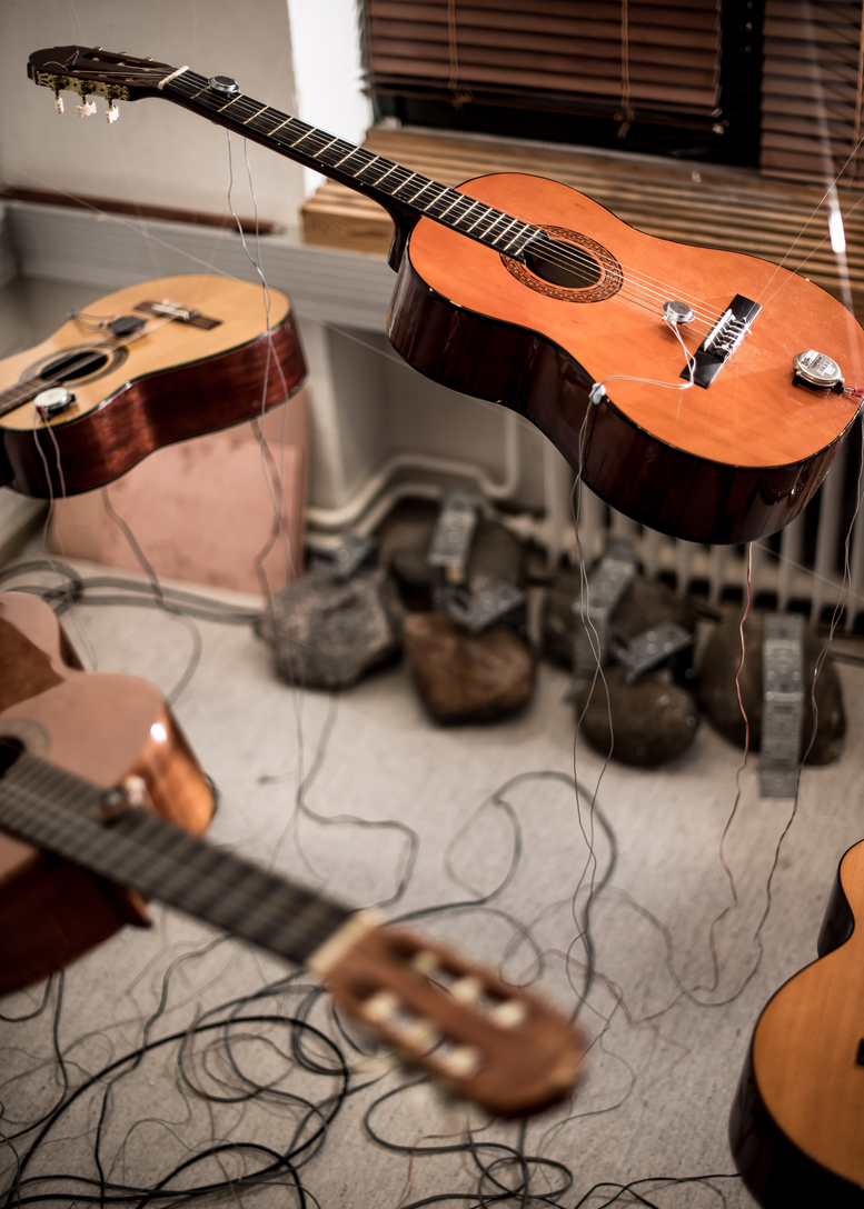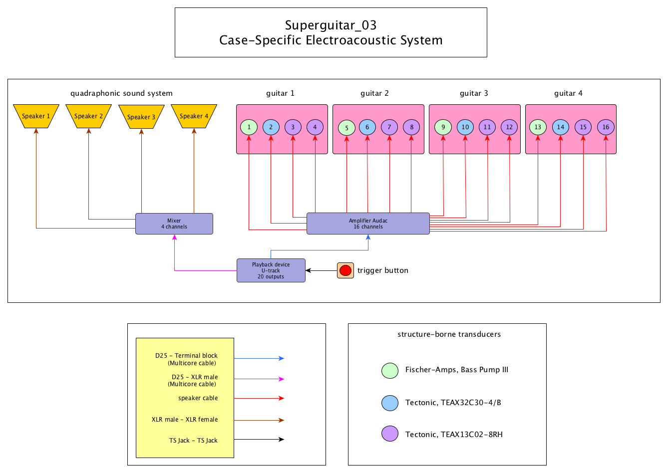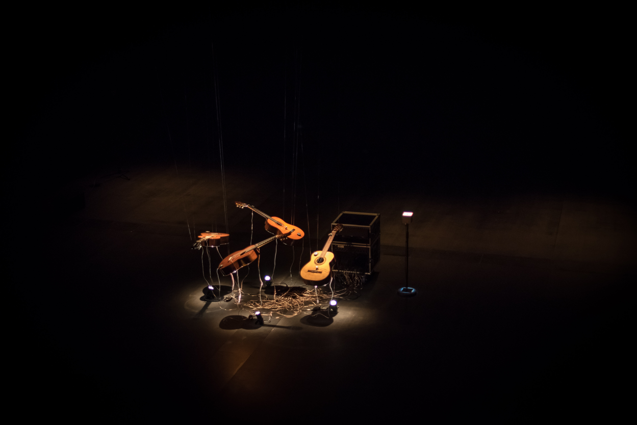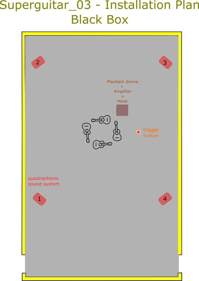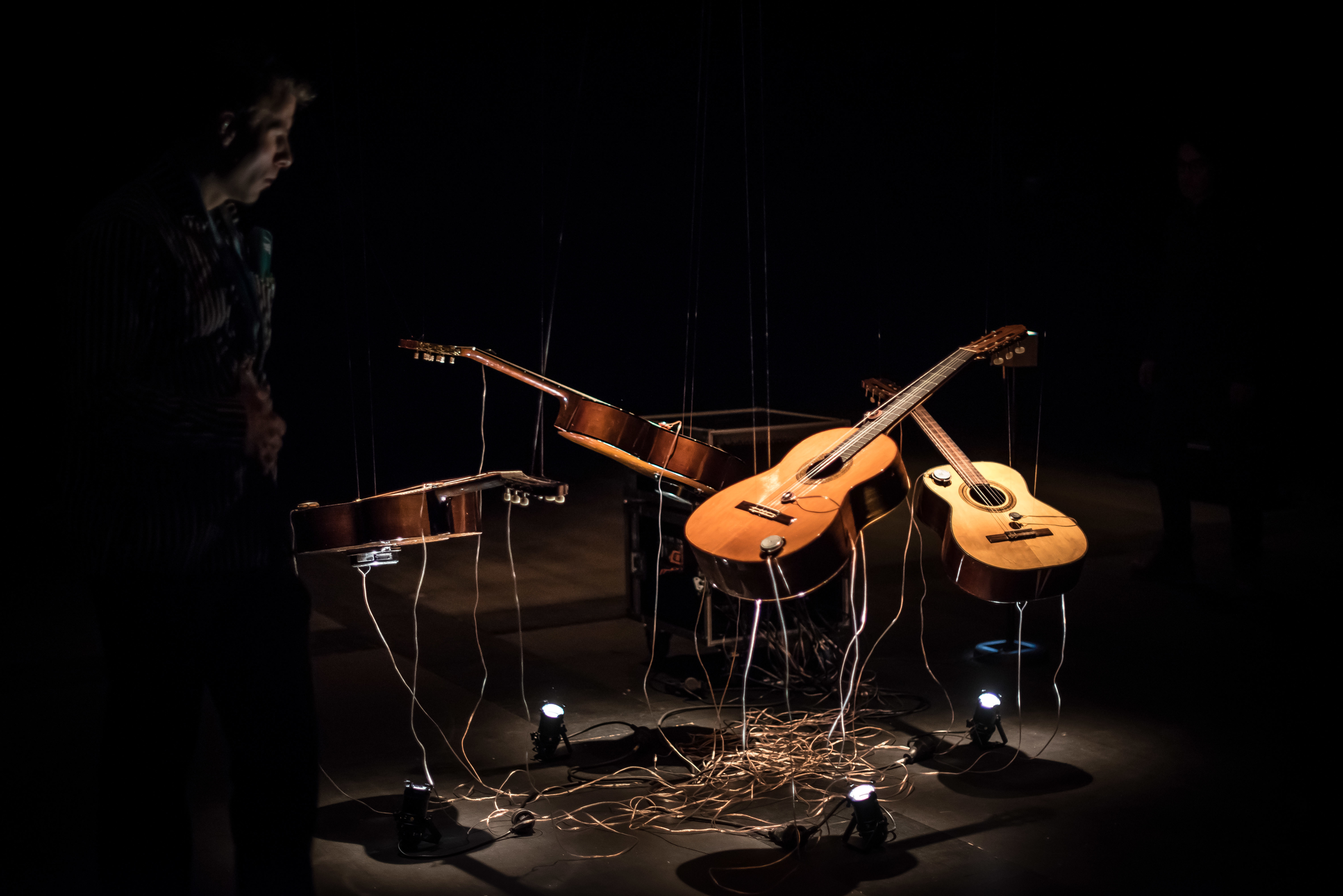 Superguitar_03 is a sound composition-installation-sculpture that studies the possibilities of adapting a traditional instrument to our contemporary world, dislocating it from its old mode of existence. It is part of a series of acoustic guitars that I have augmented, performed and composed with since 2009. These guitars question the interpretation of a traditional object, in this case a sonic object, through a reconfiguration and expansion of its aesthetical and technical resources. I do believe in the notion that art can influence society by allowing us to imagine other possible ways of being. In Superguitar_03, four acoustic guitars are suspended forming a circle and sixteen different structure-borne transducers are attached to them. The visitor entering the installation space, triggers the composition by pushing a button, and the composition plays a multichannel sound sequence that combines specific frequencies in the transducers to make the body and strings of the guitar resonate. Four speakers on the edges of the space play back a soundscape in very soft volume, inviting the audience to move closely to and far away from the sound sculpture.