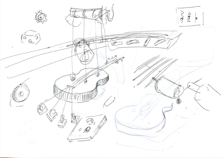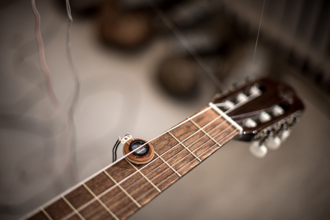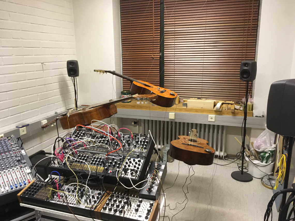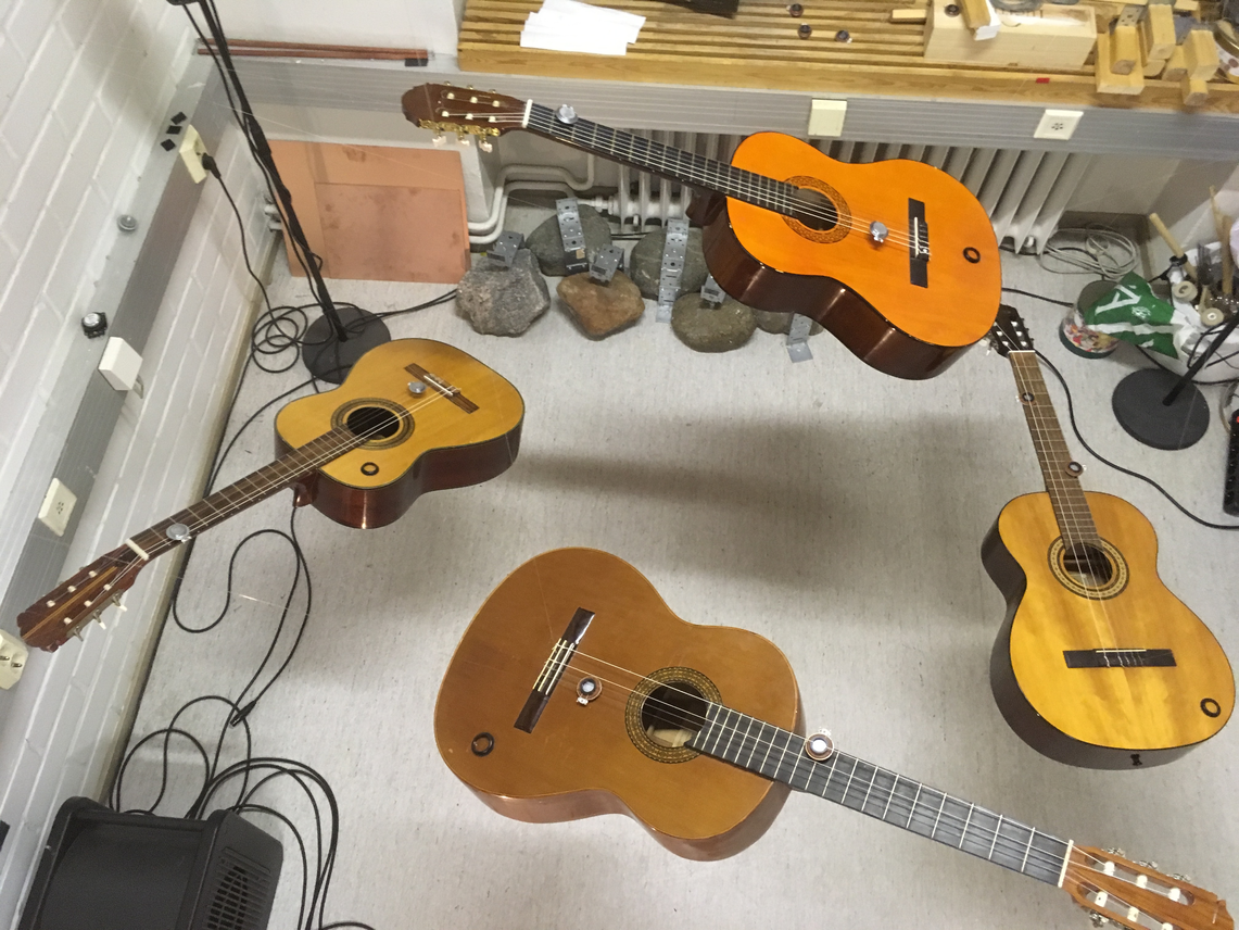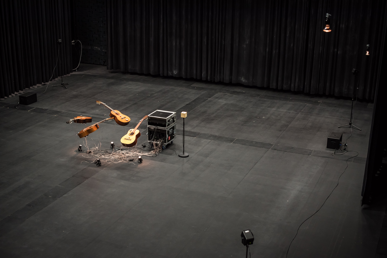 Superguitar_03 is a sound composition-installation-sculpture that studies the possibilities of adapting a traditional instrument to our contemporary world, dislocating it from its old mode of existence. It is part of a series of acoustic guitars that I have augmented, performed and composed with since 2009. These guitars question the interpretation of a traditional object, in this case a sonic object, through a reconfiguration and expansion of its aesthetical and technical resources. I do believe in the notion that art can influence society by allowing us to imagine other possible ways of being. In Superguitar_03, four acoustic guitars are suspended forming a circle and sixteen different structure-borne transducers are attached to them. The visitor entering the installation space, triggers the composition by pushing a button, and the composition plays a multichannel sound sequence that combines specific frequencies in the transducers to make the body and strings of the guitar resonate. Four speakers on the edges of the space play back a soundscape in very soft volume, inviting the audience to move closely to and far away from the sound sculpture.