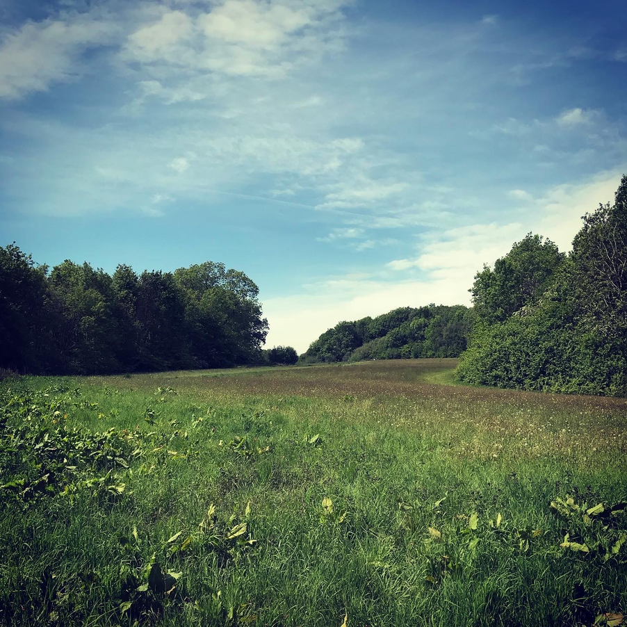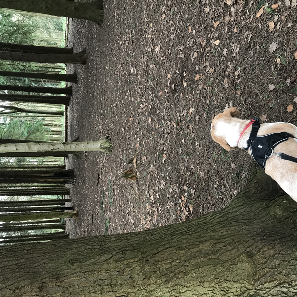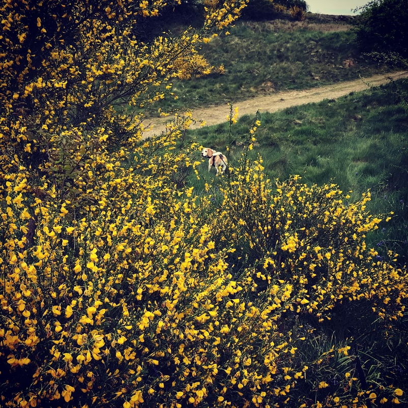 My canine companion seems particularly at home in this woodland and meadow environment, zigzagging through the younger pine trees, crossing the motorway over a footbridge, and bounding through the long spring grasses.