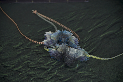 PROLOGOS sets the archi-scene of Tragedy and the Goddexxes by speculating on what kind of speech/alphabet/naming might configure the Data Ocean Theatre program. The installation thus clusters computer altered oceanic sand glyphs, randomly generated gender-neutral game-deities names, one dead pencil slate urchin, and other heterogeneous matters in order to form a crypto-sceno-graphic debut for the project.