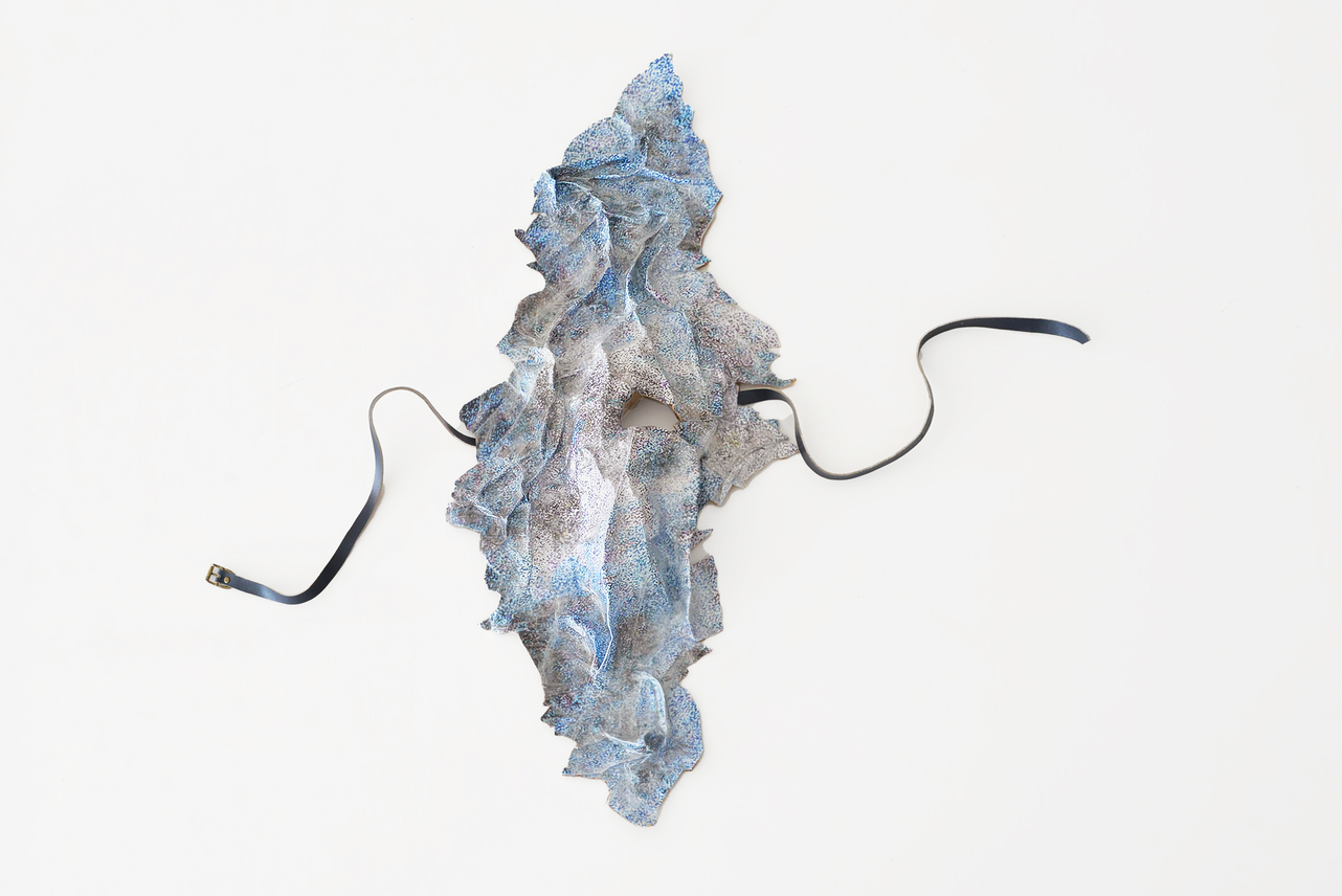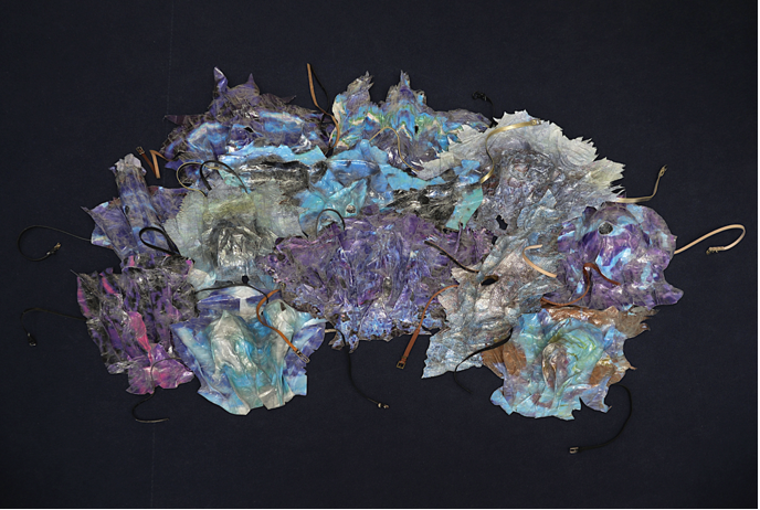 STASIMON is the fourth episode of Tragedy and the Goddexxes. A coral-like (or garbage patch-like) chorus of twelve XL fake-ceramic masks—inspired by ancient Greek tragedy headpieces and made from altered prints of contemporary scientific data from marine research—chants a polyphonic Lamento composed using recordings of various failed computer hard drives.