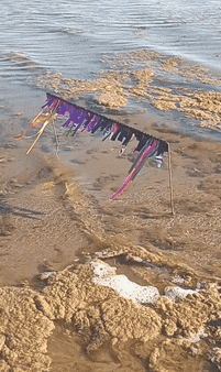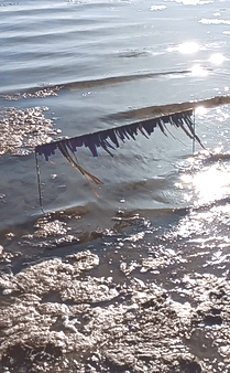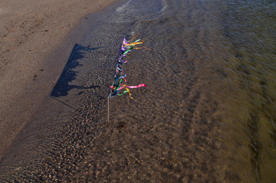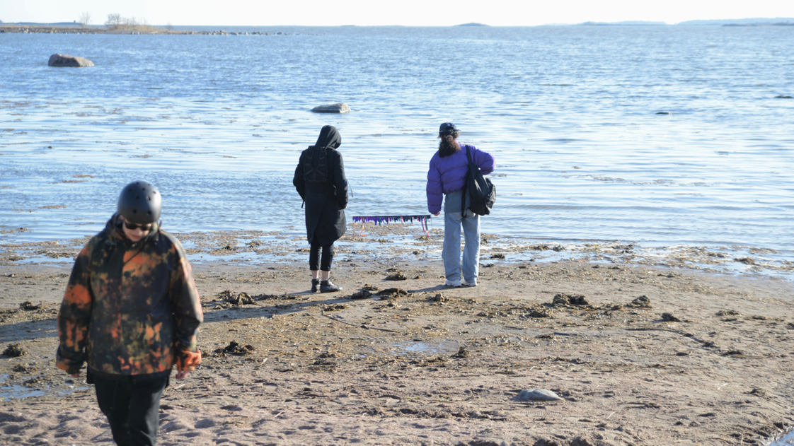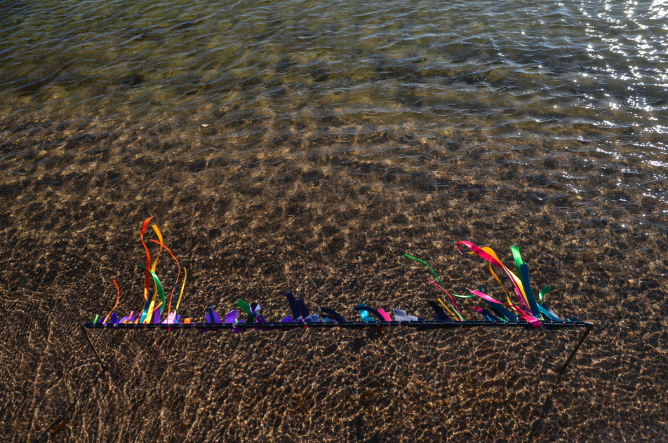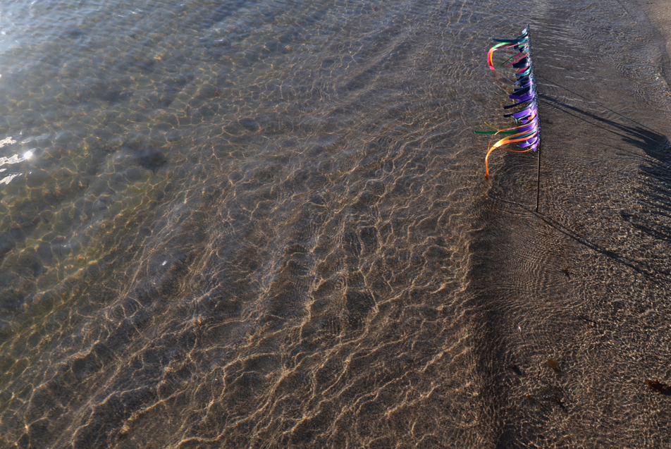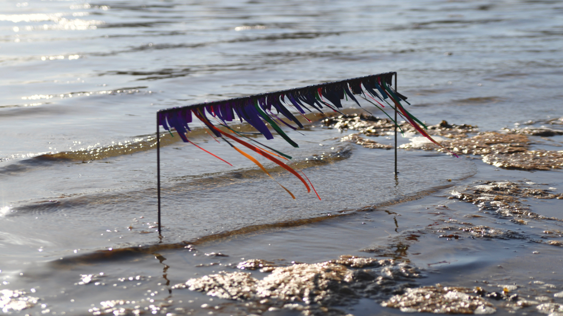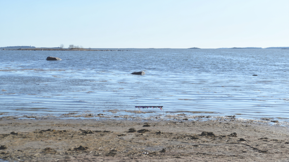 Two tables of marine research data representing current variations in salinity and temperature in the Baltic Sea* are combined and transformed into a miniature theatre frame/backdrop, and placed on the waterline of a beach for an entire day.