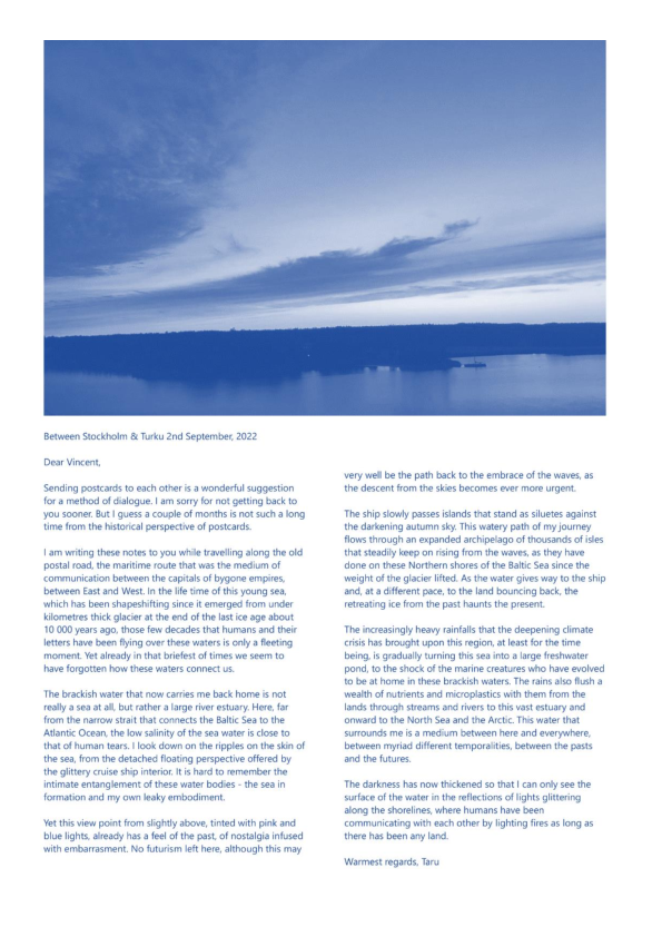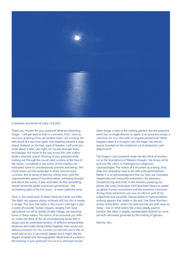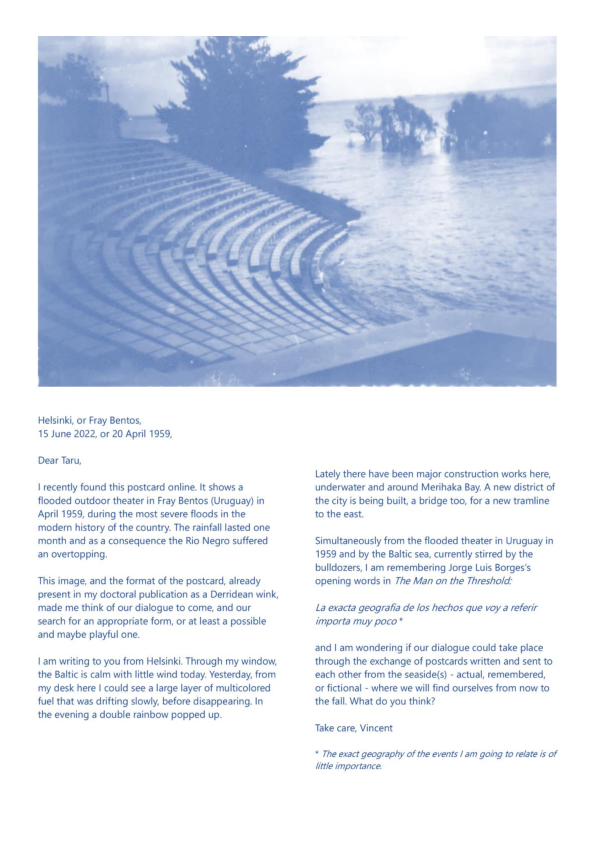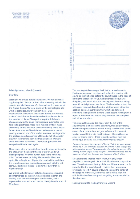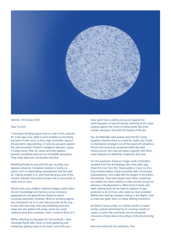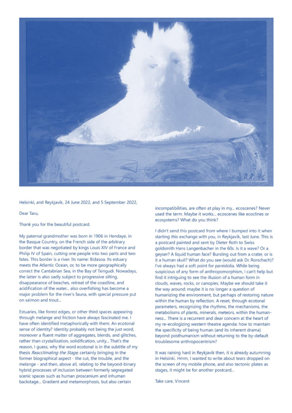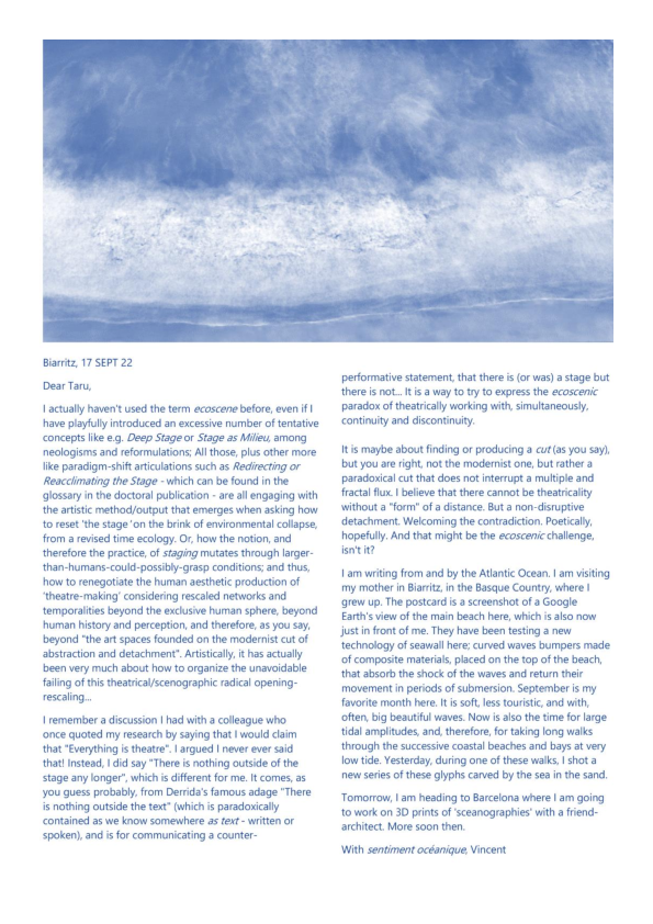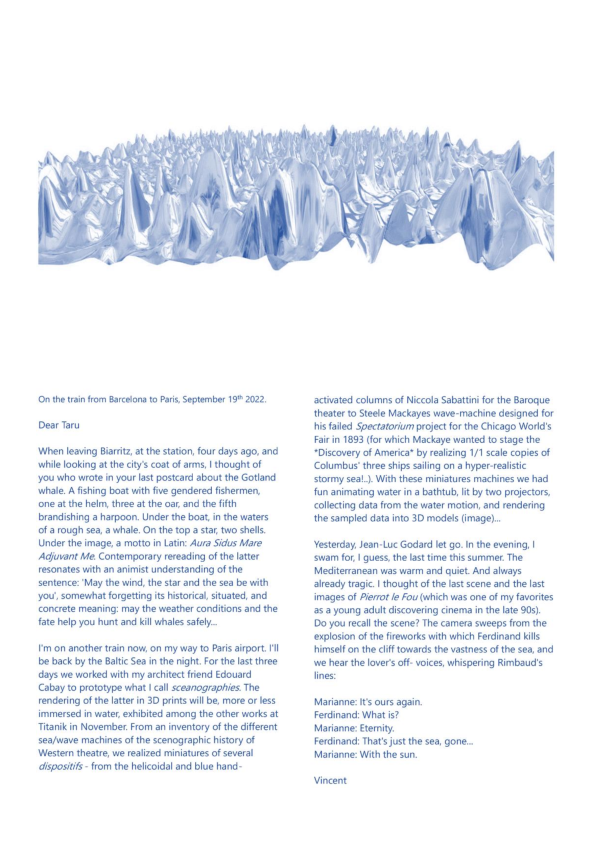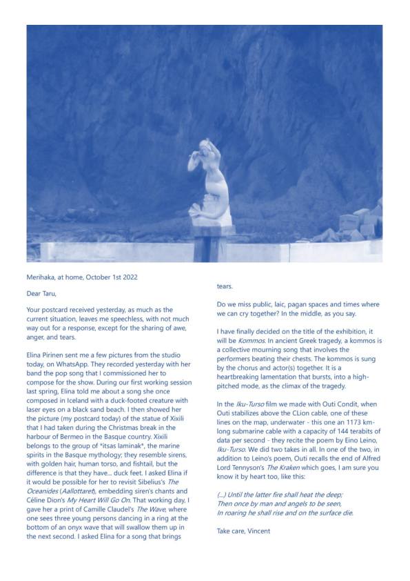 Data Ocean Theatre (D.O.T.) is a four-year artistic research project that explores the intersection of myths, Western theatre memory, new media, digital animism, climate emergency, sea and ocean transformations, queer subcultures, and technological mutations in relation to aspects of “submersion” as a contemporary living condition. Expanding on the claimed unsustainability of Western theatre’s anthropocentric foundations, D.O.T. examines how the notion and practice of the stage transform amidst climate urgency, technological hypergrowth, and discipline-fluid hybridization. It seeks to generate experiments on a new temporal ecology of the stage, examining how theatre-making infrastructures might transition within a multi-agential dynamic of emergence. D.O.T. appears, disappears, and reappears through a series of polymorphic artworks and research affordances based on the ecodramaturgical consideration of the simultaneous phenomenon of 1. the rising sea and ocean levels, 2. the exponential growth of big data in our informational age, and 3. the emotional overload caused by the latter two happening, projection, and prophecy. D.O.T. explores inherited sea-and-ocean-oriented myths and revisits theatre plays with a marine backdrop, looking simultaneously into contemporary nautical vocabulary and sea imagery used as metaphors for computational realities. D.O.T. proposes to re-mythologise Western theatre foundations by forming an alternative pantheon for a queer, hydrofeminist, and technoanimist reset of the “tragic,” at the interplay between a syncretic marine mythology and the ambiguities of “technology-as-monster” narratives. In D.O.T. project, the forces and fragilities of transforming marine ecosystems intersect with algorithmic-conditioned life and crossbreeding of diverse art disciplines and research fields based on collaborations, generating imaginary prototypes for future societal constructions in the floods. D.O.T. is structured around several key components: the prologue Simultaneous Environments, featuring a series of experimental works; the central project Tragedy and the Goddexxes, which culminates in three public exhibitions; and a series of workshops, residencies, and a final publication in the form of an exposition on the Research Catalogue. This final publication of the DATA OCEAN THEATRE postdoctoral artistic research project (2021–2024) titled 'DATA OCEAN THEATRE (OUT OF THE BLUE); A Discipline-Fluid Postdoctoral Artistic Research Project Exposition' performs on the Research Catalogue as both an aesthetico-epistemic object in its own right and as an a posteriori account, or catalogue raisonné, of the project. It also acts as a supplement to the author's doctoral publication, Reacclimating the Stage (Skenomorphoses), completing the latter to form a diptych on the Research Catalogue. Similar to the doctoral publication, the non-linear, non-hierarchical, and non-chronological reading, or hyper-reading, of Data Ocean Theatre (Out of the Blue) invites its visitors to navigate freely and compose their own fluid, archipelagic, and tidal experience to make sense of the project as a whole.