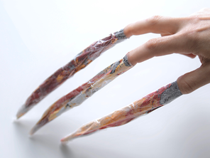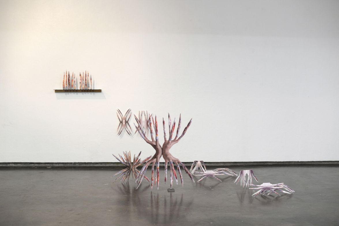 Object-creatures derived from the filmed performance θάλασσα κλύζει πάντα τἀνθρώπων κακά, obtained from computer-assisted deformation of the preformer's hands augmented with faux-chitin. The exocrabs are destined to multiply during the successive activations of the project in the installation space and/or on the visitor's body.