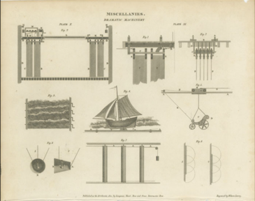 Fig.2: Dramatic machinery for a theatre set including flying carriage, boat on moving waves, flats, etc. Copperplate engraving by Wilson Lowry from Abraham Rees' Cyclopedia or Universal Dictionary of Arts, Sciences and Literature, Longman, Hurst, Rees, Orme and Brown, London, 1820.