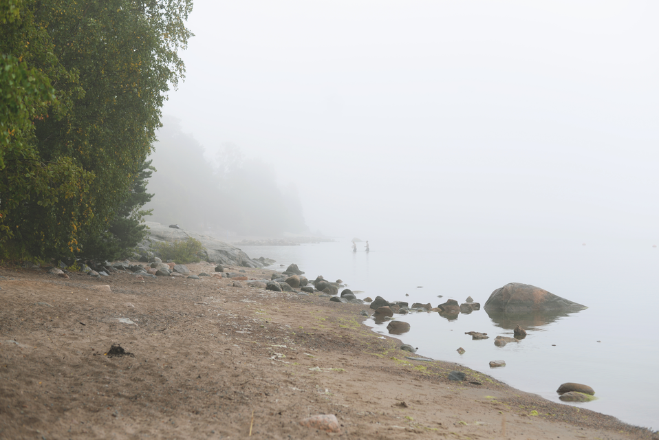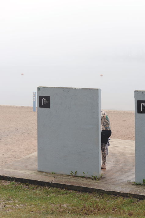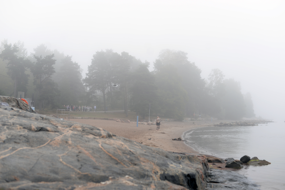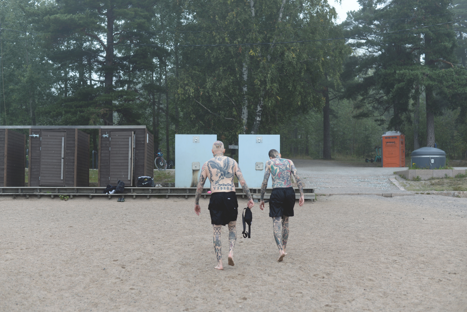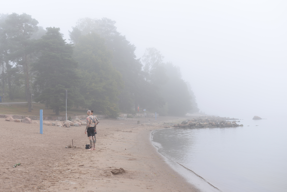 As I was uploading the project here on the Research Catalogue the week after the workshop, I realised that I was missing a wide view of the beach on the island and its shore covered in green algae. One early morning in thick fog I went there to take this shot. As I was taking pictures from the dock towards the beach, I saw two people going for a swim. As I was walking back towards the beach, I saw them getting out of the water, and as I got closer, I realised that they were tattooed almost all over their bodies. So I took a few more shots of these two people and left. As I walked back through the forest still bathed in thick white-out, I thought that these images were probably the last images of the Data Ocean Theatre project. I smiled in the fog.