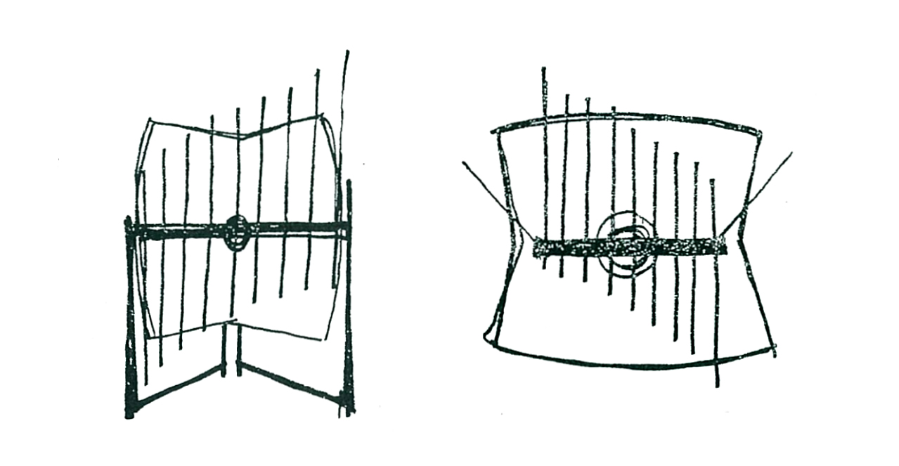 In many occasions, and in the examples above, we see how the rods are mounted to create a simple visual shape, determined by an imaginary straight (linear) line that clearly does not resemble the logarithmic curve that we see in the lengths of strings in harps and pianos or the resonating pipes of organs and marimbas. Their explorative spirit led them to try these visual arrangements of rods to allow found (non-intentional) tunings to be discovered. Here is where the Baschet played their cards most radically in favour of sharing curiosity and a willingness to engage people in sonic discoveries: not providing established tunings to avoid the temptations of trying to play conventional melodies, but to provide circumstances for amazement and surprise.