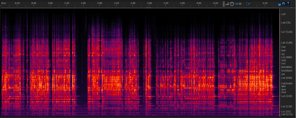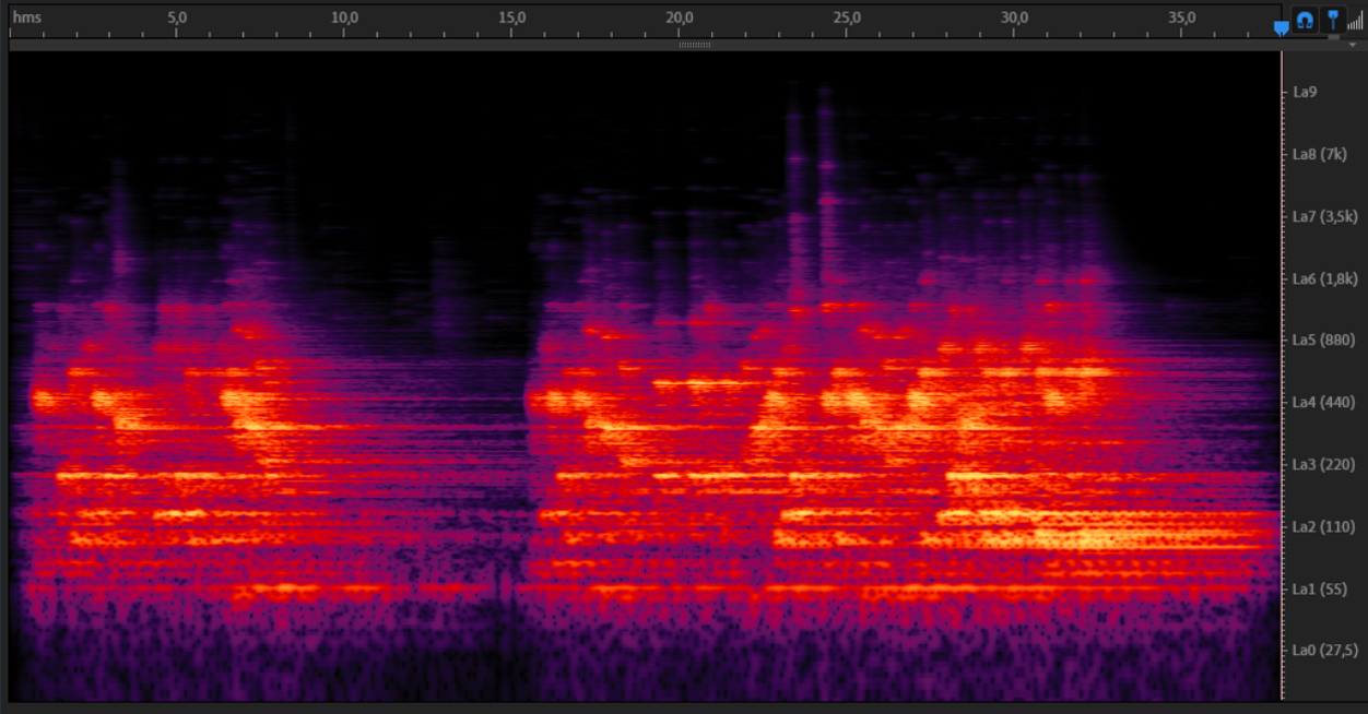 Figure 15. Audio file and spectrogram of a sound fragment performed on the Baschet monumental percussion Brontosaur, a massive piece featuring a visual arrangement of rods. (Ruiz 2015).