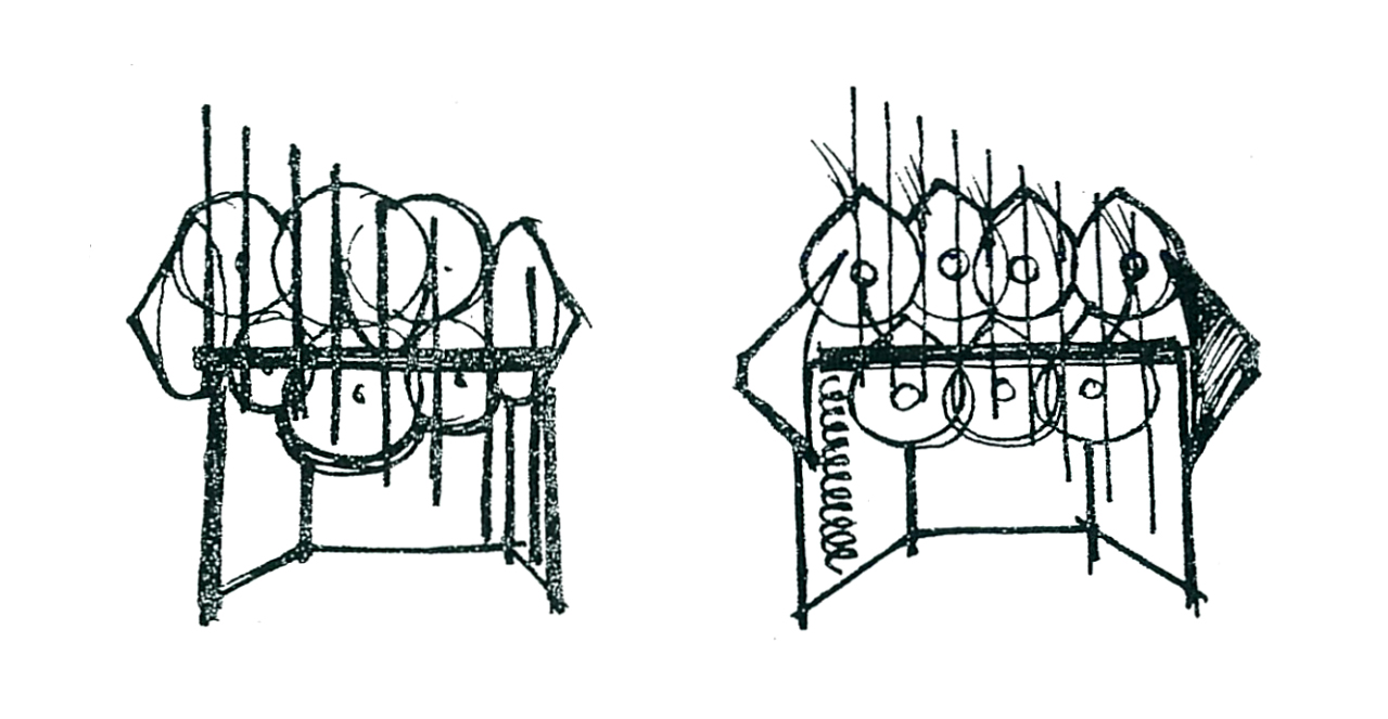 Figures 10, 11, 12, 13. Illustrations of Osaka’70 Baschet Sound Sculptures (Tomikophone, Kawakamiphone, Watanabephone, Sakamotophone) by Alain Villeminot. Source: François Baschet's personal archive.