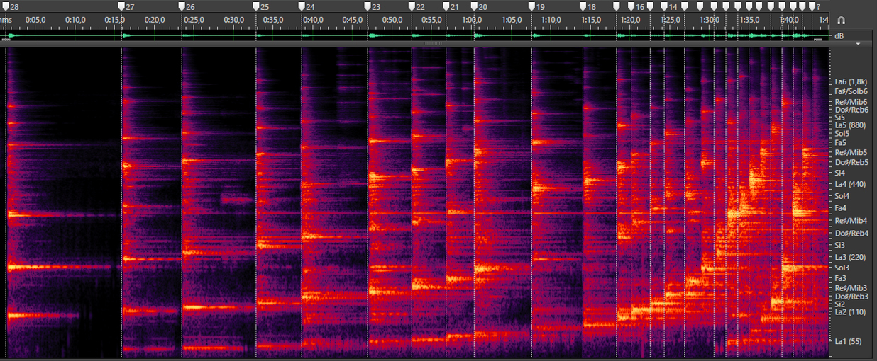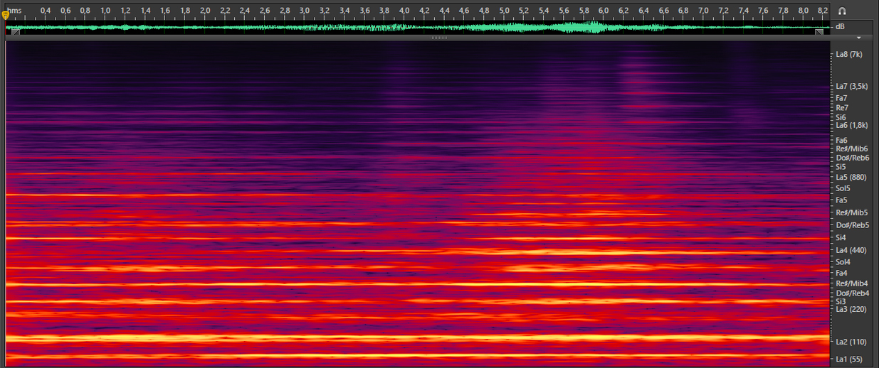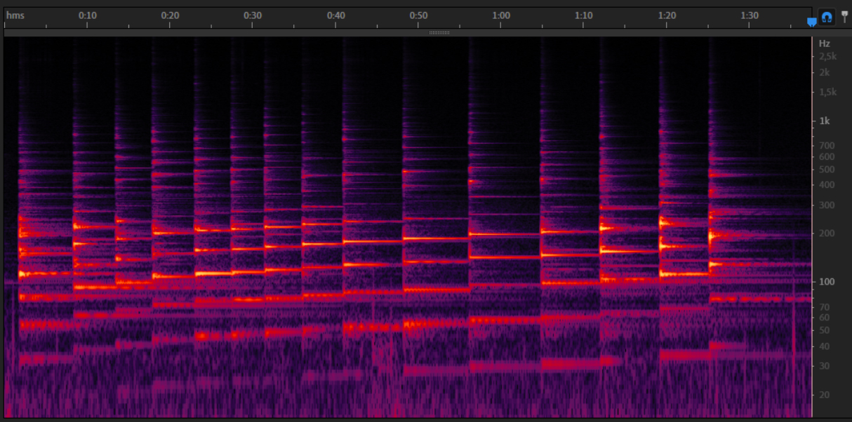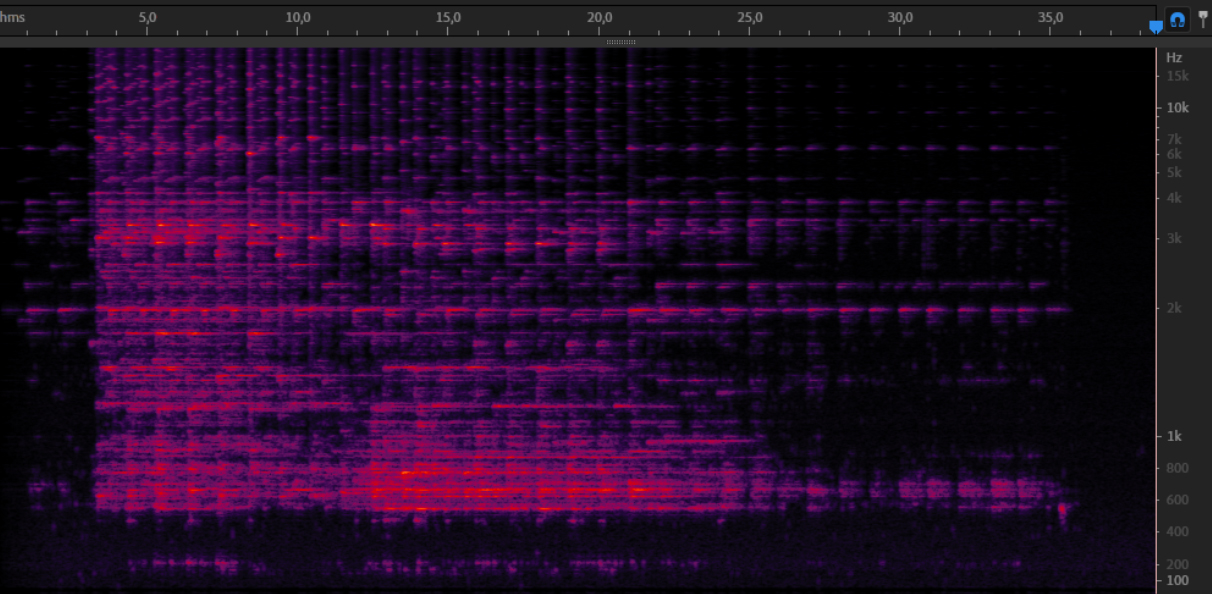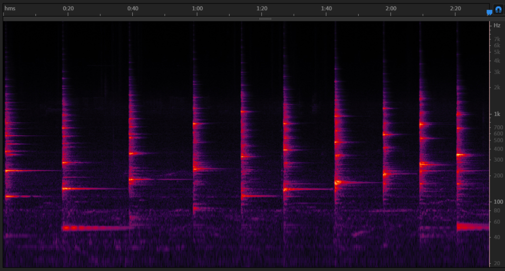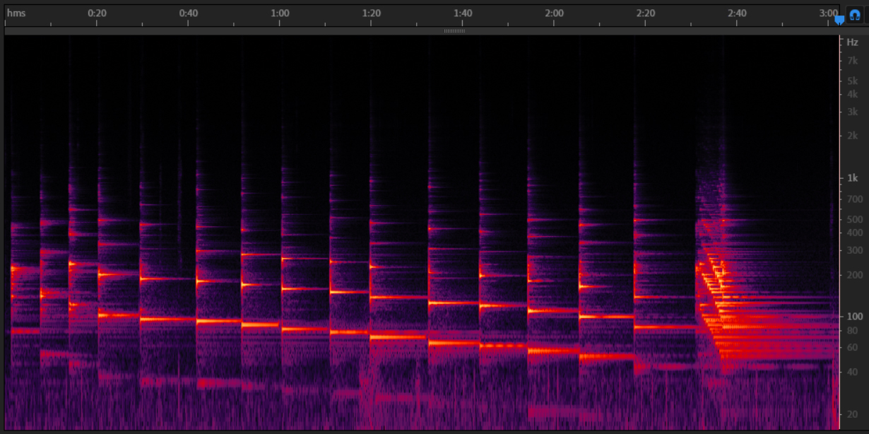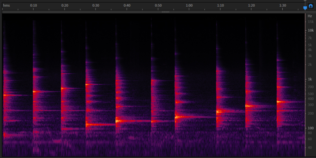 In the spectrogram above we can clearly see the harmonic series generated by bowing one of the rods: the rod is forced to oscillate differently to its natural inharmonic vibrating mode.