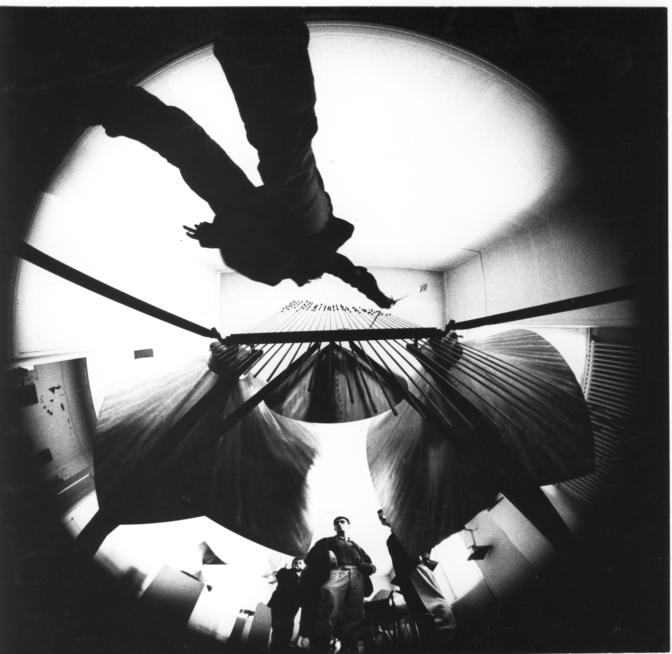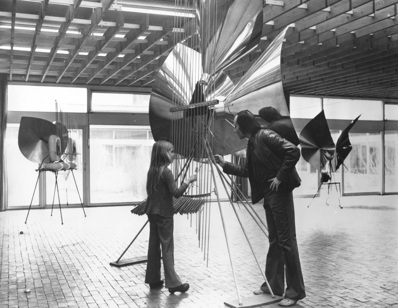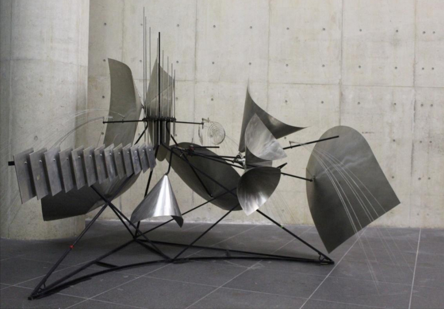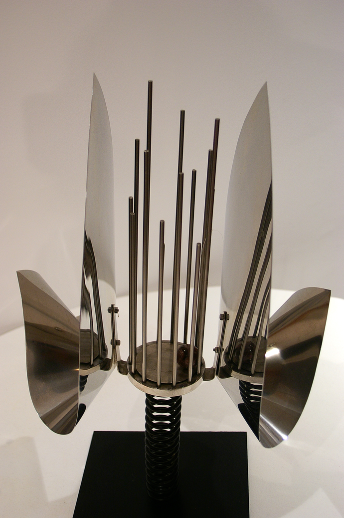 This example is representative of many mobile sound sculptures made by the Baschets, particularly by François, in which there is an element of randomness in its activation. In most cases these are small or medium sized pieces, using a spring-mounted base or other means to add a touch of unpredictability. The pieces were meant to be easily activated with a push to start a rocking movement, so the ball rolls around inside the cage formed by the rods, striking them. The rods were not tuned to any particular music scale, since the intention was to offer random pitches. This piece, and others like it, invite the user to let go of control and appreciate sonic events as they occur, somewhat unpredictably but dependent on user input: the direction and amplitude of rocking.