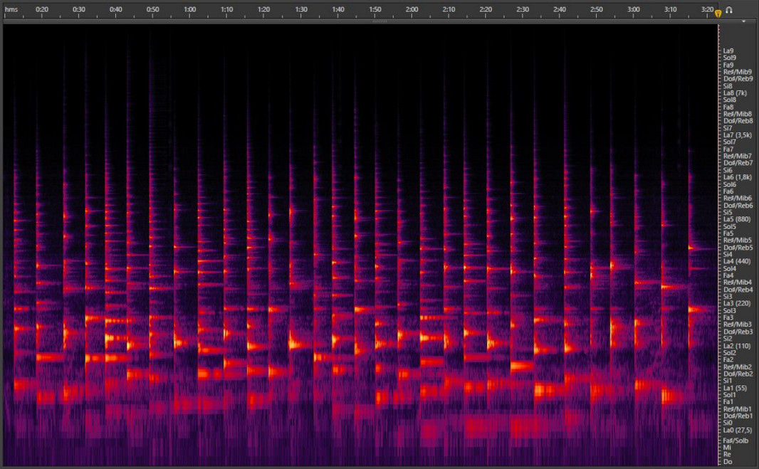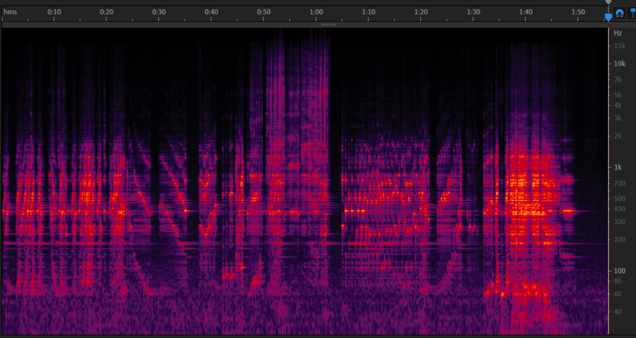 In the video above of Brontosaur we hear two rods being bowed along with Martí Ruiz’s voice. The musical result was artistically desired, but we understand it is confusing to differentiate the voice from the rods, precisely because they are all compound sounds in a harmonic spectrum. To aid the reader’s understanding, we have included the sound of a bowed rod on its own below.