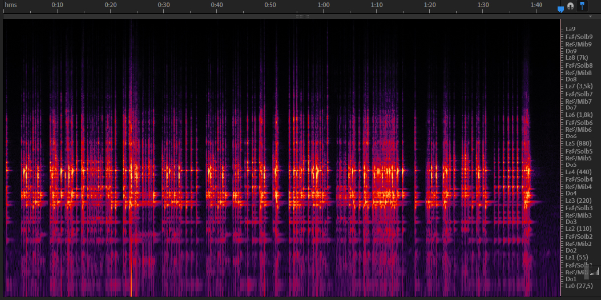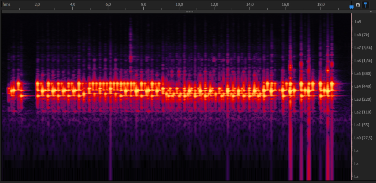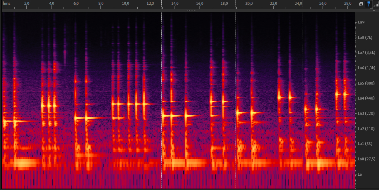 Here we can once again hear the primary vibrational mode of those plates, the fundamental pitch and the less prominent overtones, bringing a metallic nuance to the timbral qualities. The subsonic bands of frequency we see in the spectrum are produced by the excitation of the overall system, despite the small size of the piece.